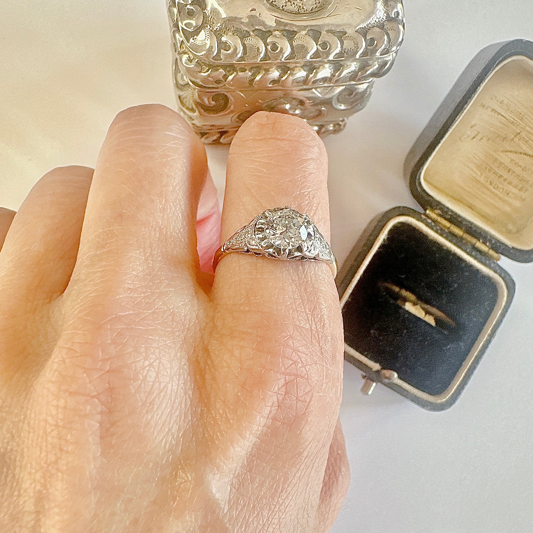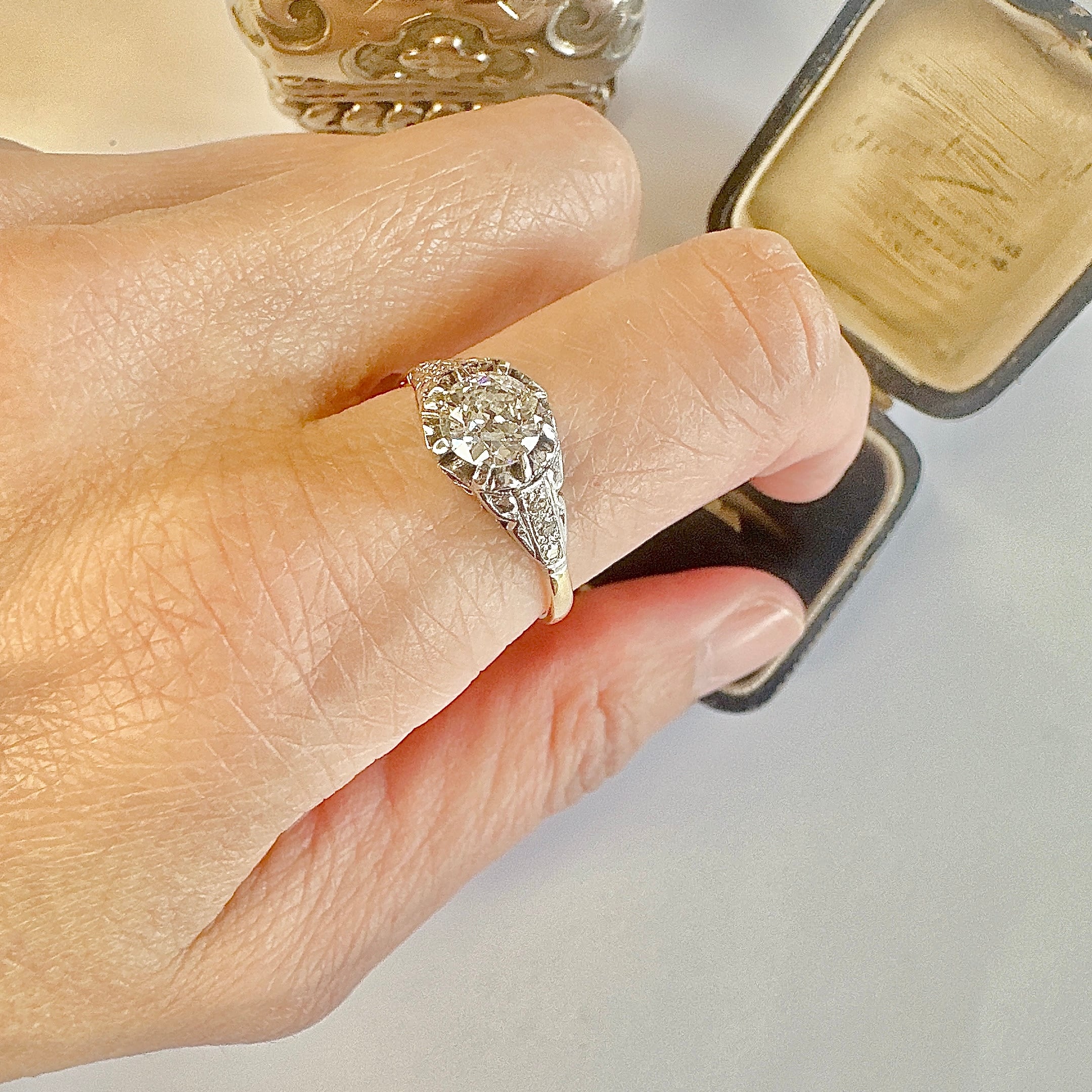 石を支えるセッティングには、当時ならではの繊細な技巧が随所に見て取れます。主石を引き立てるように設えられたショルダーには、小さなダイヤモンドが連なり、指先へと流れるようなラインを描きます。あくまで主石の美しさを引き立てるための静かな演出です。そして、縁取るように施されたミルグレイン。粒のひとつひとつが細やかに刻まれ、光をやわらかく受け止めながら、全体に穏やかな陰影と奥行きをもたらしています。