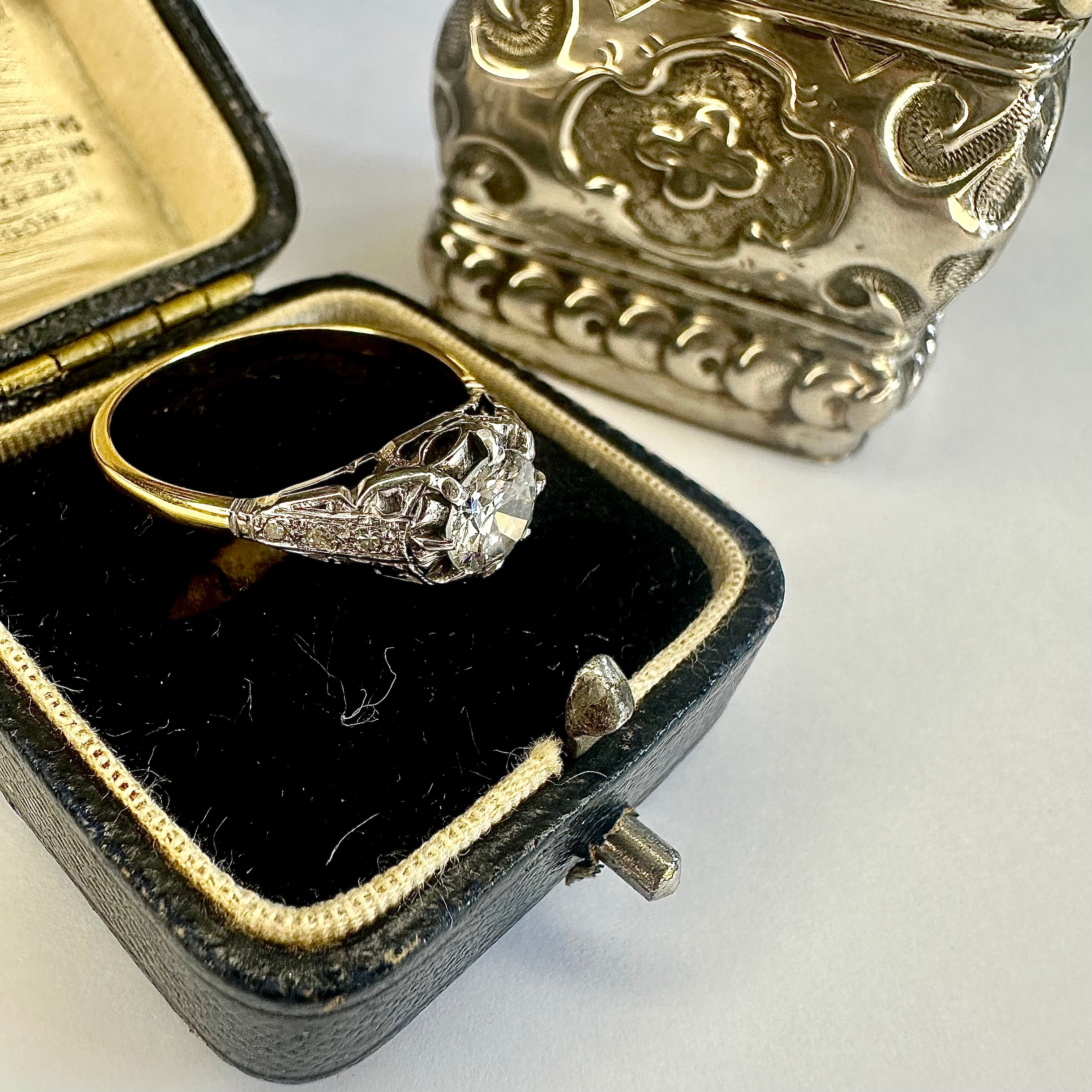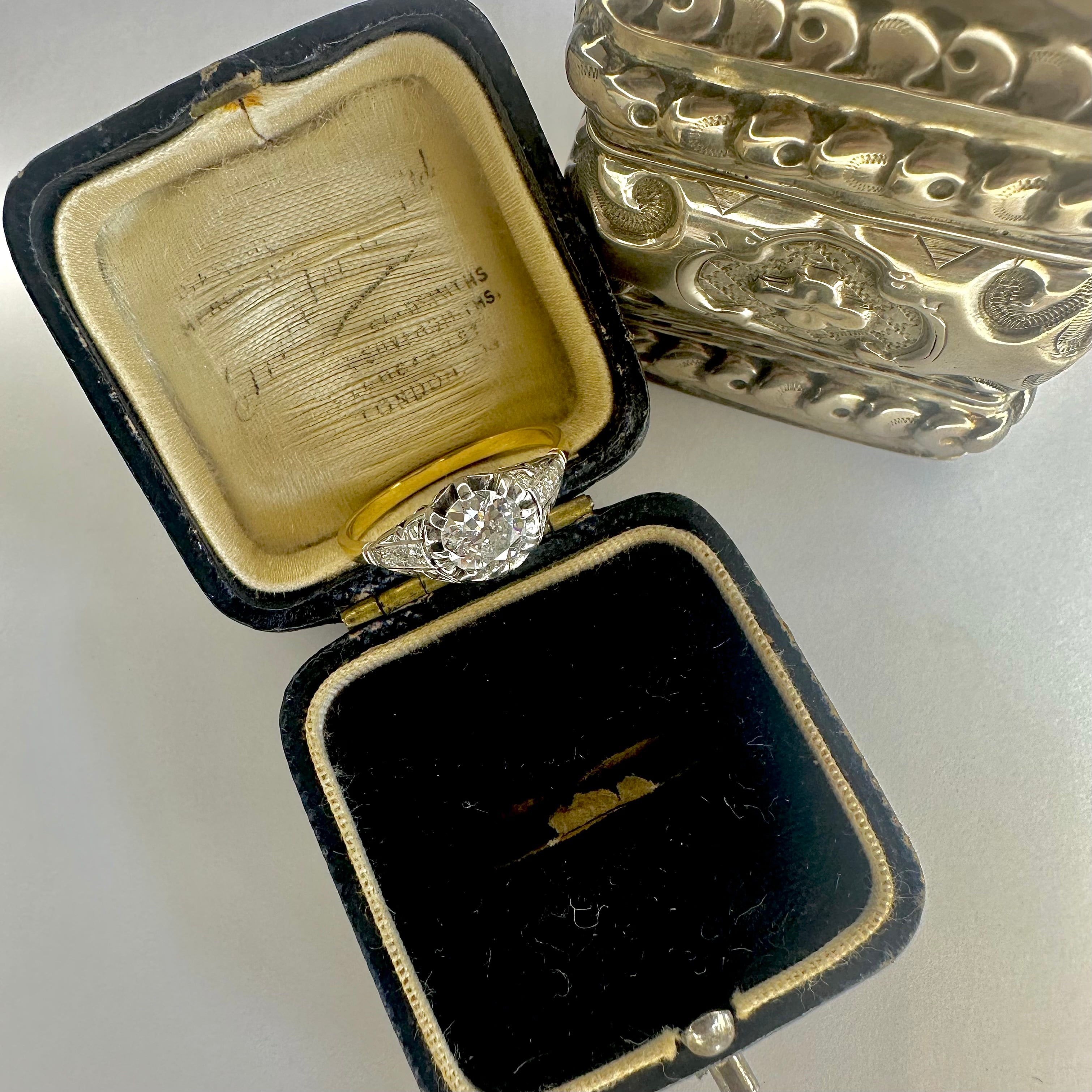※ 100年以上前の古いお品になりますので、経年によるアンティーク品特有の微小なスレなどルーペで見てわかる程度にございます。ダイヤモンドはルーペでのぞくと内包物はありますが、肉眼でみえるものではなく、瑞々しい輝きを楽しませてくれます。カケはございません。