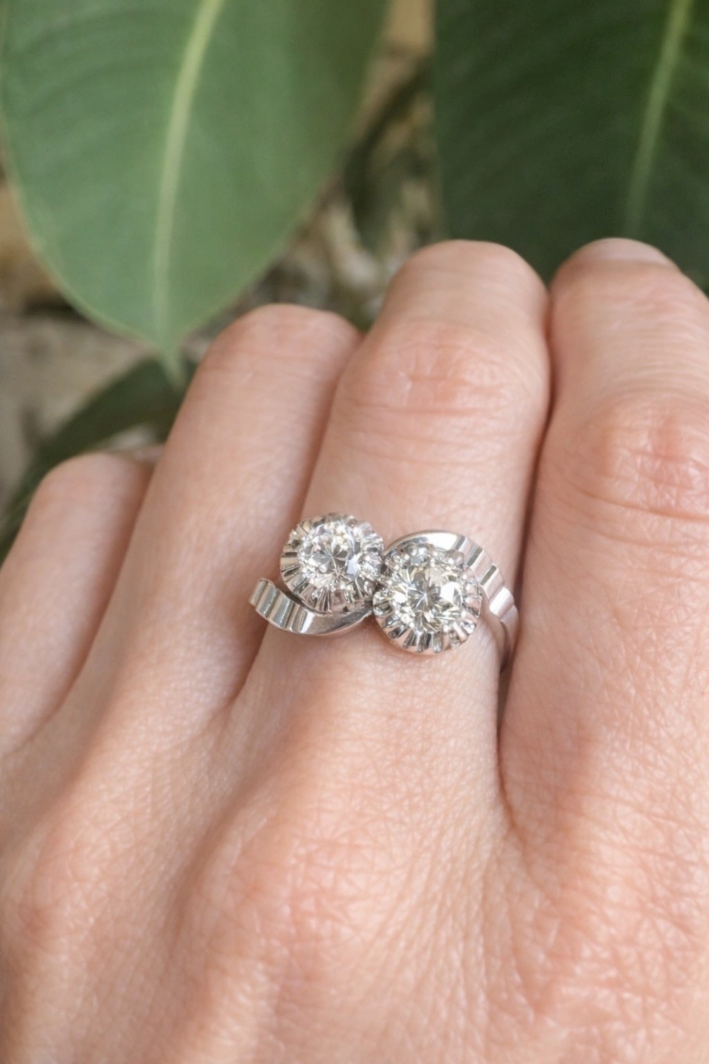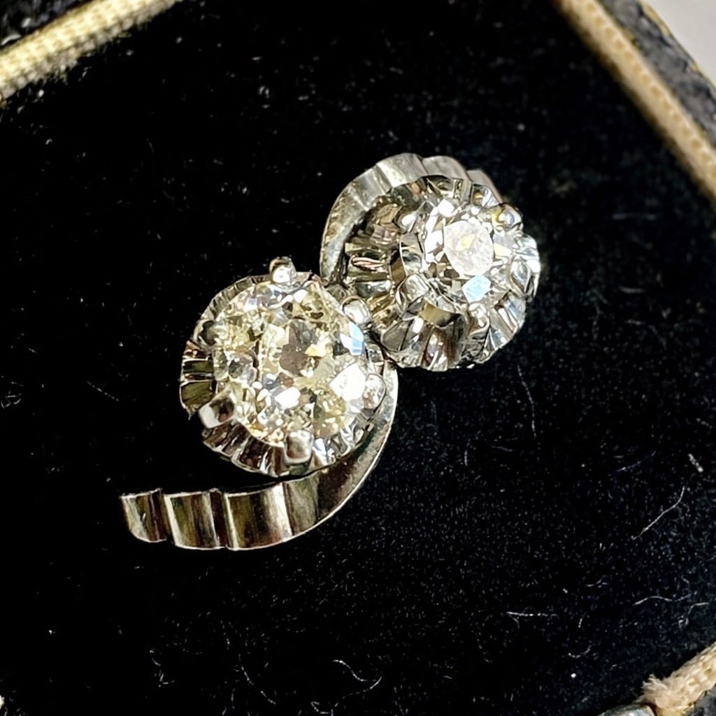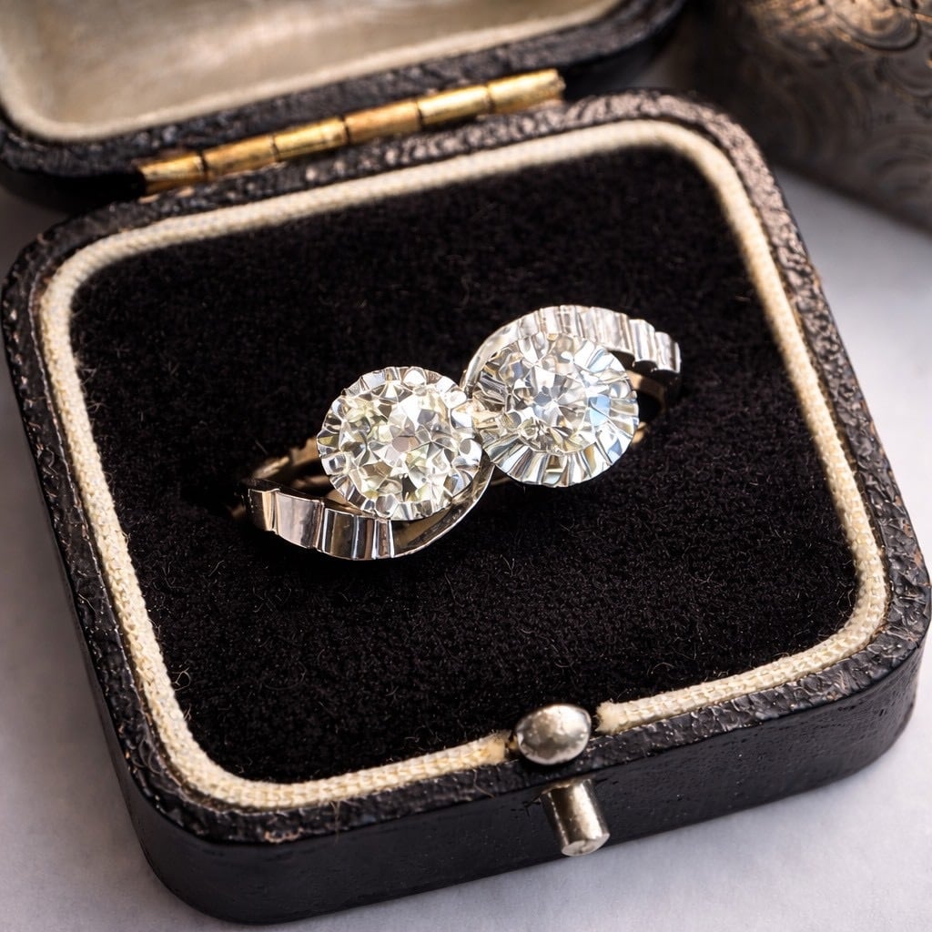 オールドマインカットとオールドヨーロピアンカット、それぞれに個性を持つ石が寄り添う、トワ・エ・モワのリングです。