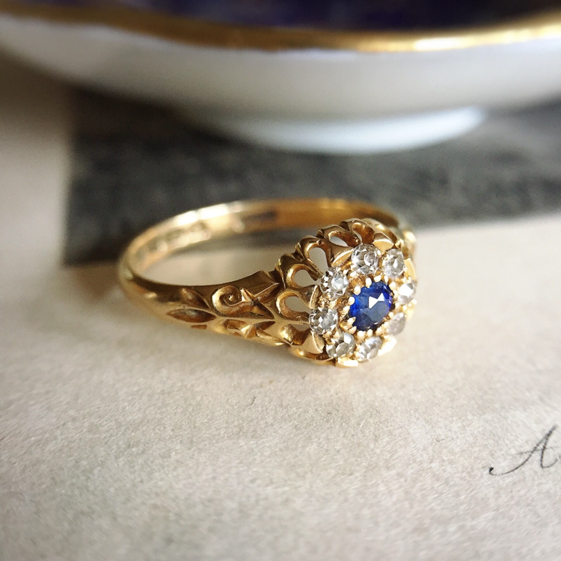 小さいながらもオールドヨーロピアンカットダイヤモンドのキラキラした輝きがイエローゴールドの地金に反射し、サファイアの瑞々しい色合いをより一層引き立て醸し出される柔らかで上品な佇まいが美しいクラスターリングです。