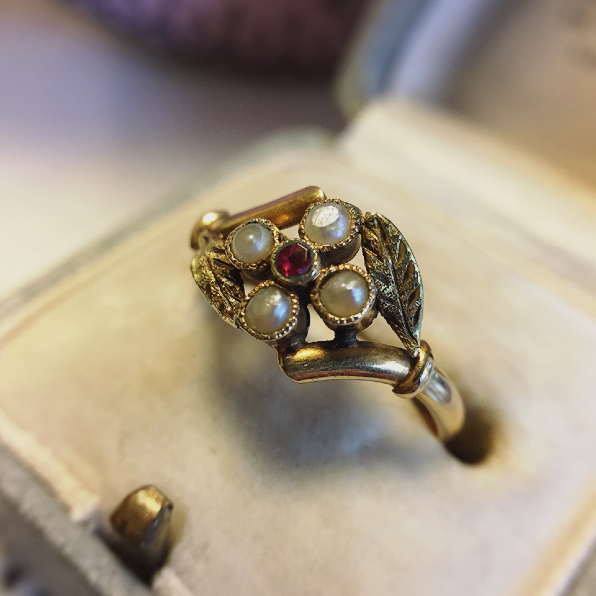 花を支えるショルダー部分はアシンメトリーに宿り木の葉が添えられ、ロマンティックなデザインとアールヌーヴォーらしい曲線、ちいさいながらもアンティークらしい深みがしっかりと感じ取る事が出来るリングです。このようなリングはイギリスの物が多くあるのですが、こちらのリングはフランスの18kを表すイーグルヘッドの刻印がシャンクの外側に小さく打たれてます。