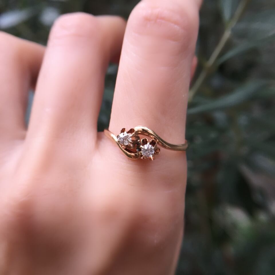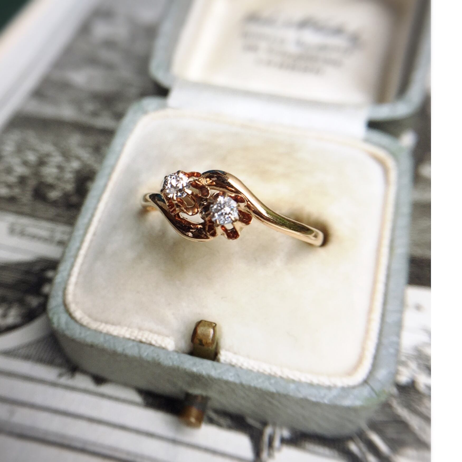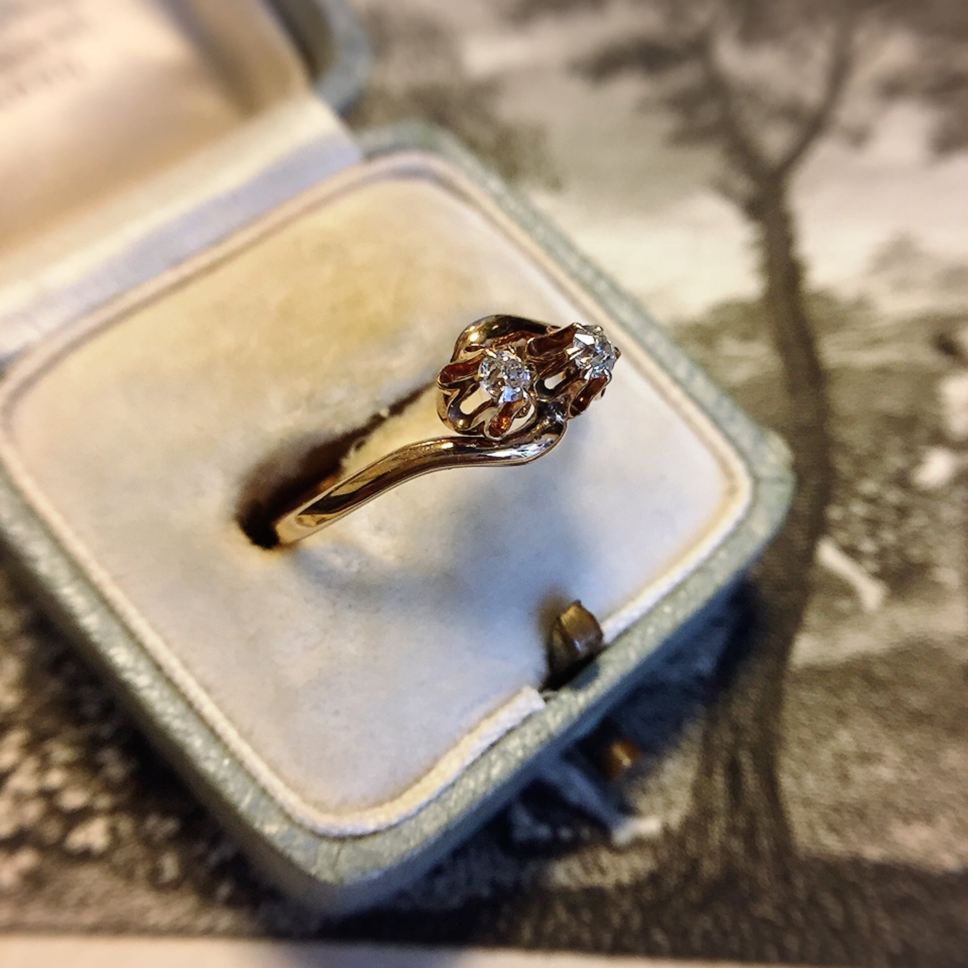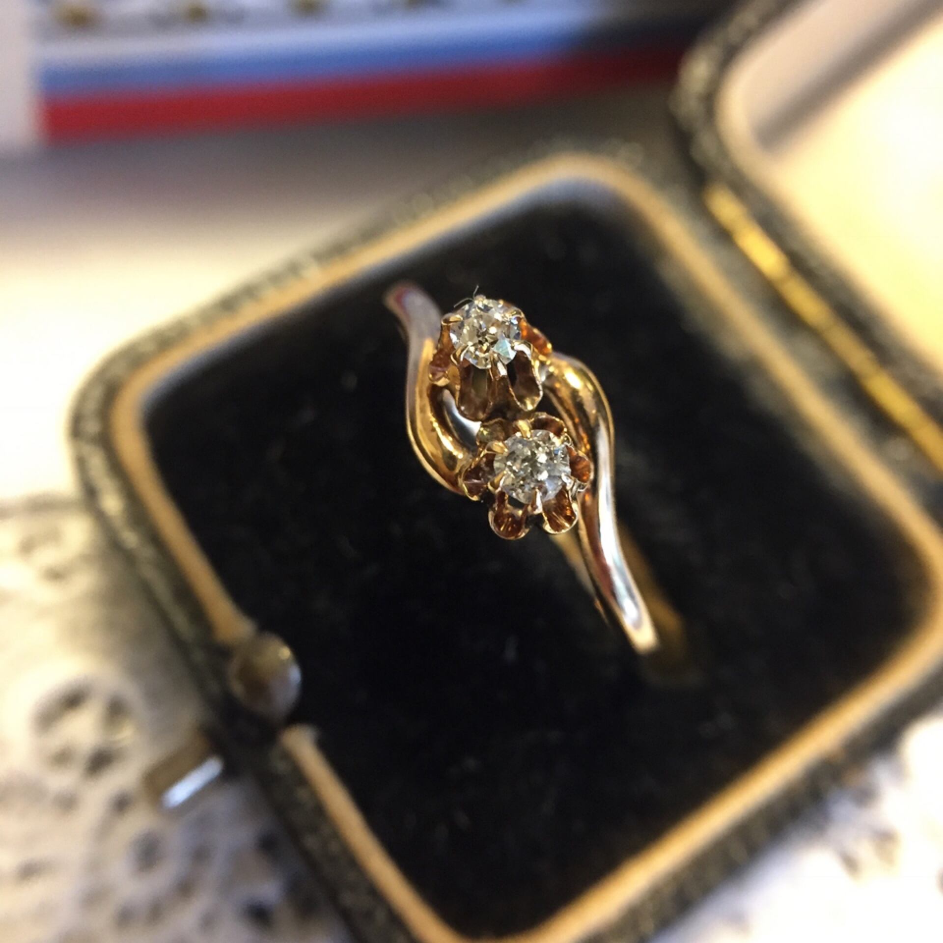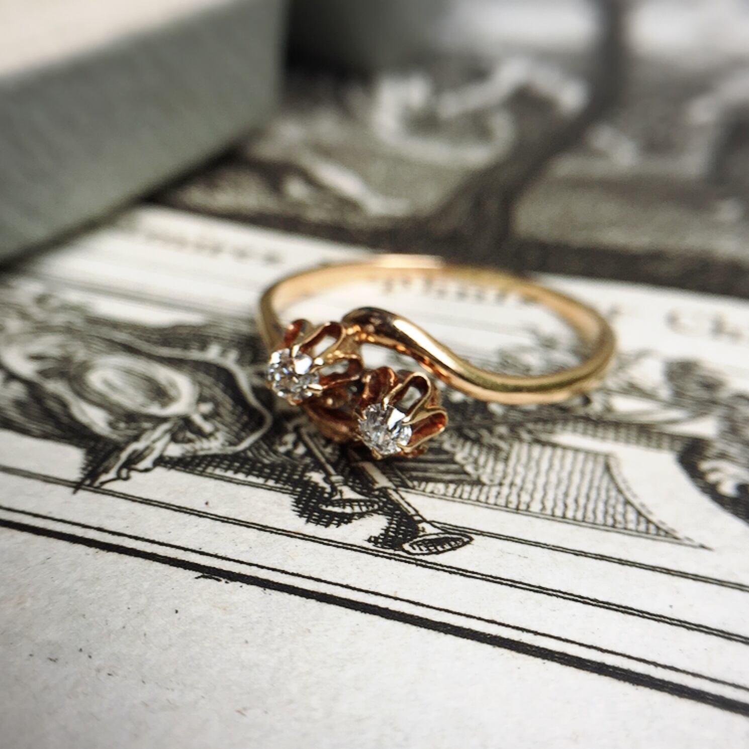 花の形を象った台座にオールドマインカットダイヤモンドをセットした「トワ・エ・モア」つまり「貴方と私」という2つ並んだ石を恋人同士になぞらえたデザインを示す20世紀初頭に流行したリングです。