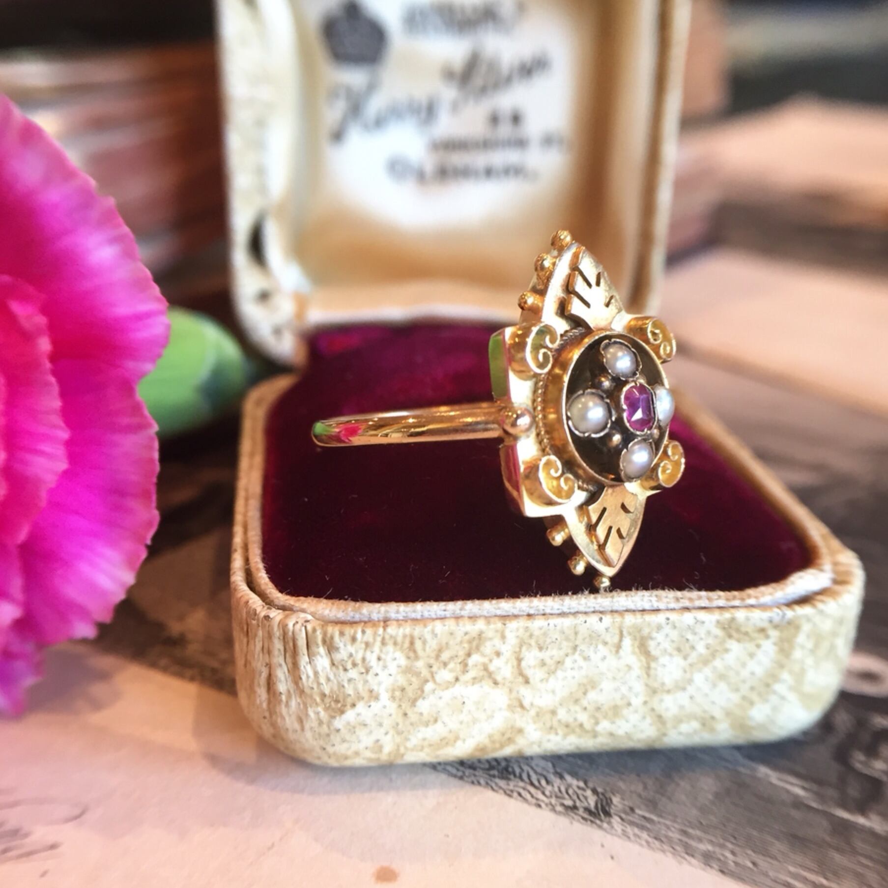 四つ葉のクローバーの葉のように4つ並べられた絹のようにシルキーに輝くパールの中心には鮮烈な一粒のピンク色のルビーが添えられ、それぞれが花びらのような爪にすっぽりと収まり、一つ一つ手の込んだ美しいリングです。