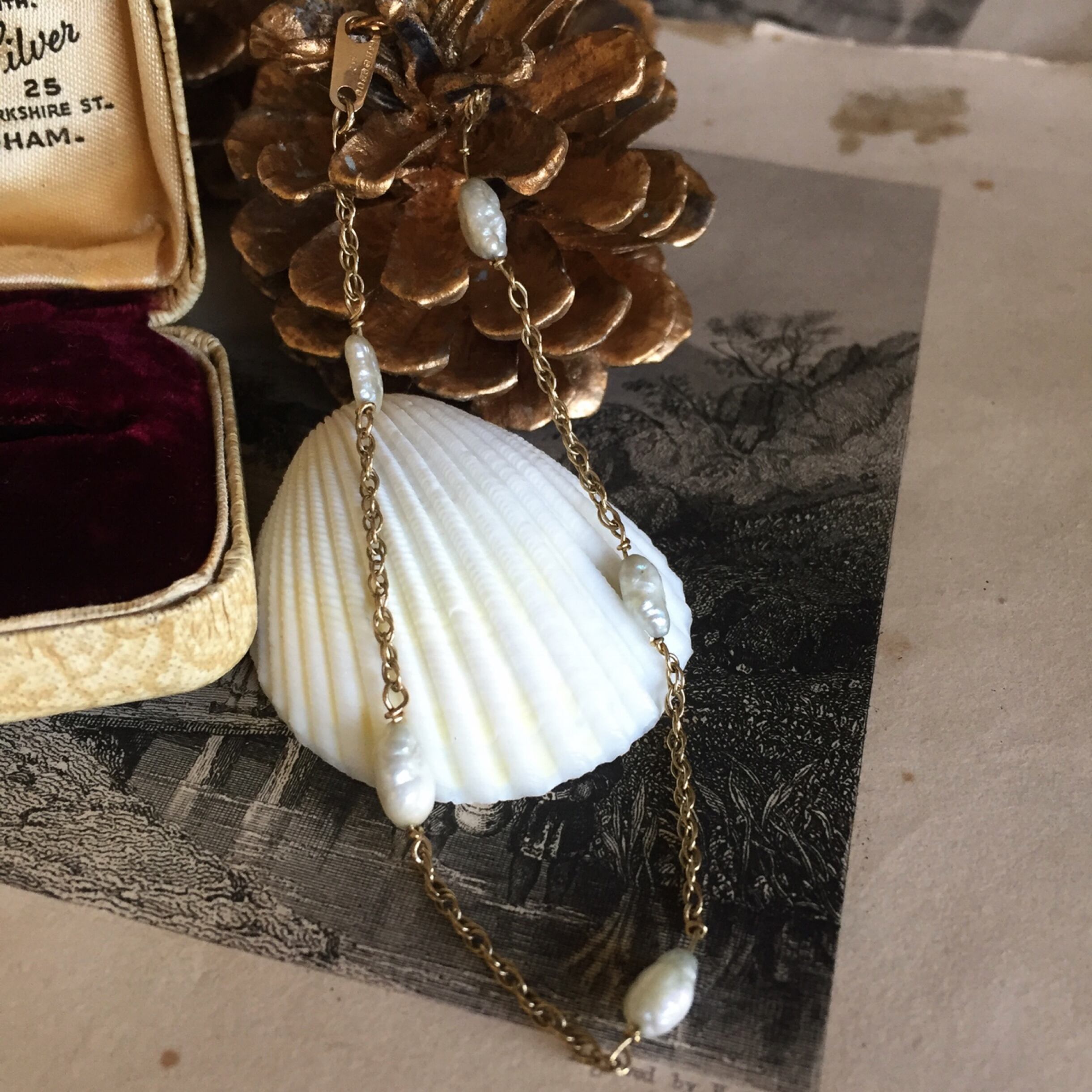 一見シンプルに見える細身の9kゴールドのチェーンもよく見ると凝った作りで輪が連なり、そこにセットされたバロックパールが4つそれぞれの違う表情をみせてくれます。