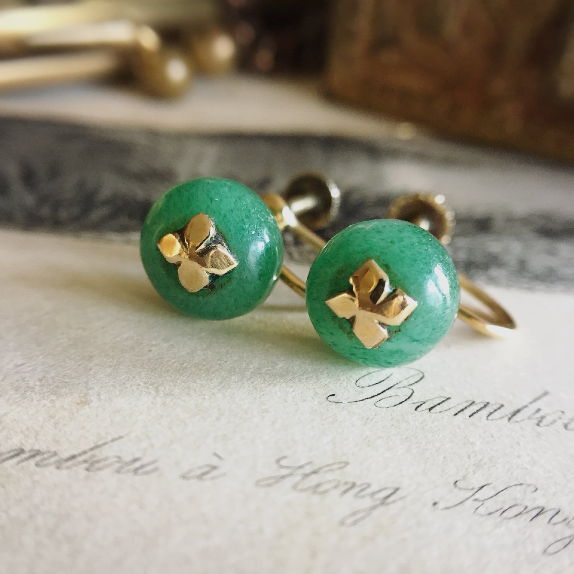 ジェイドはアンティークジュエリーでは20世紀初頭、特にアールデコ期に非常に愛された宝石で、このイヤリングもその頃に製作され物と思われます。