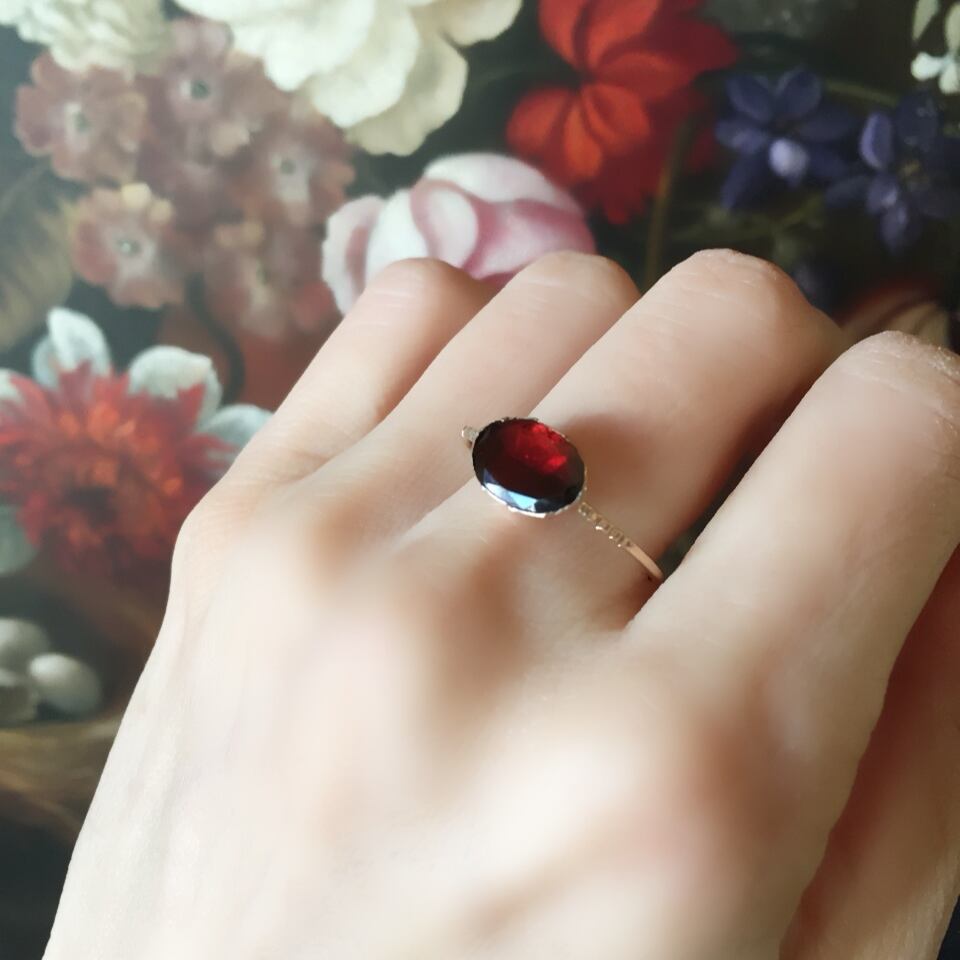 フラットカットされたガーネットがすっぽり台座にセットされ、後ろはクローズドバックとなっており、シンプルさの中に美しさが宿るリングは19世紀後半のヴィクトリア時代の物になります。
