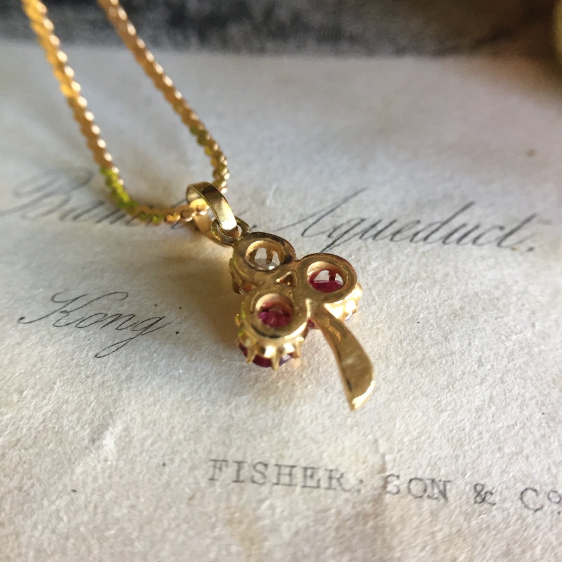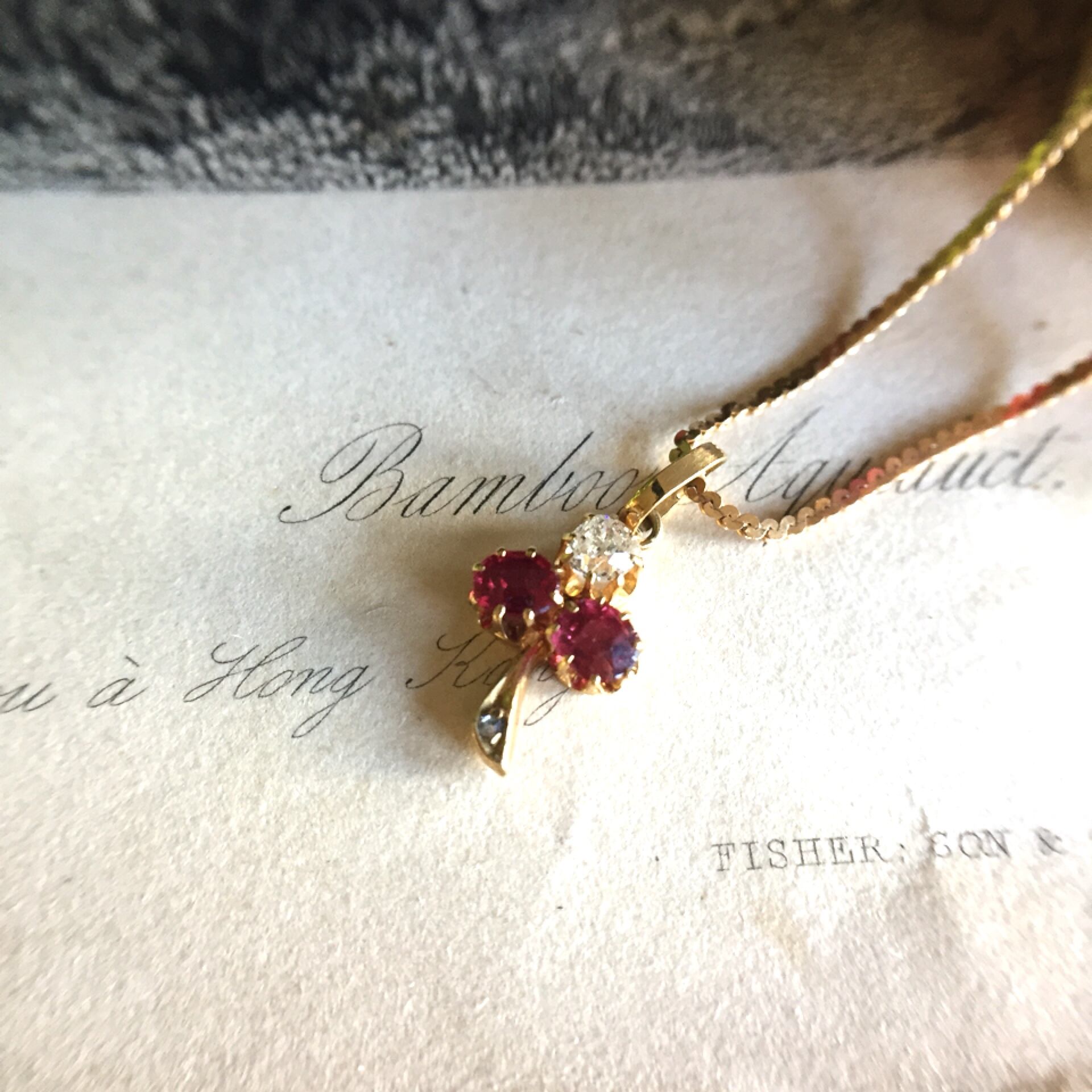 一般的にはクローバーと呼ばれるアイルランドの国花”シャムロック”をダイヤモンドとルビーの葉を3枚合わせて象った愛らしいペンダント。