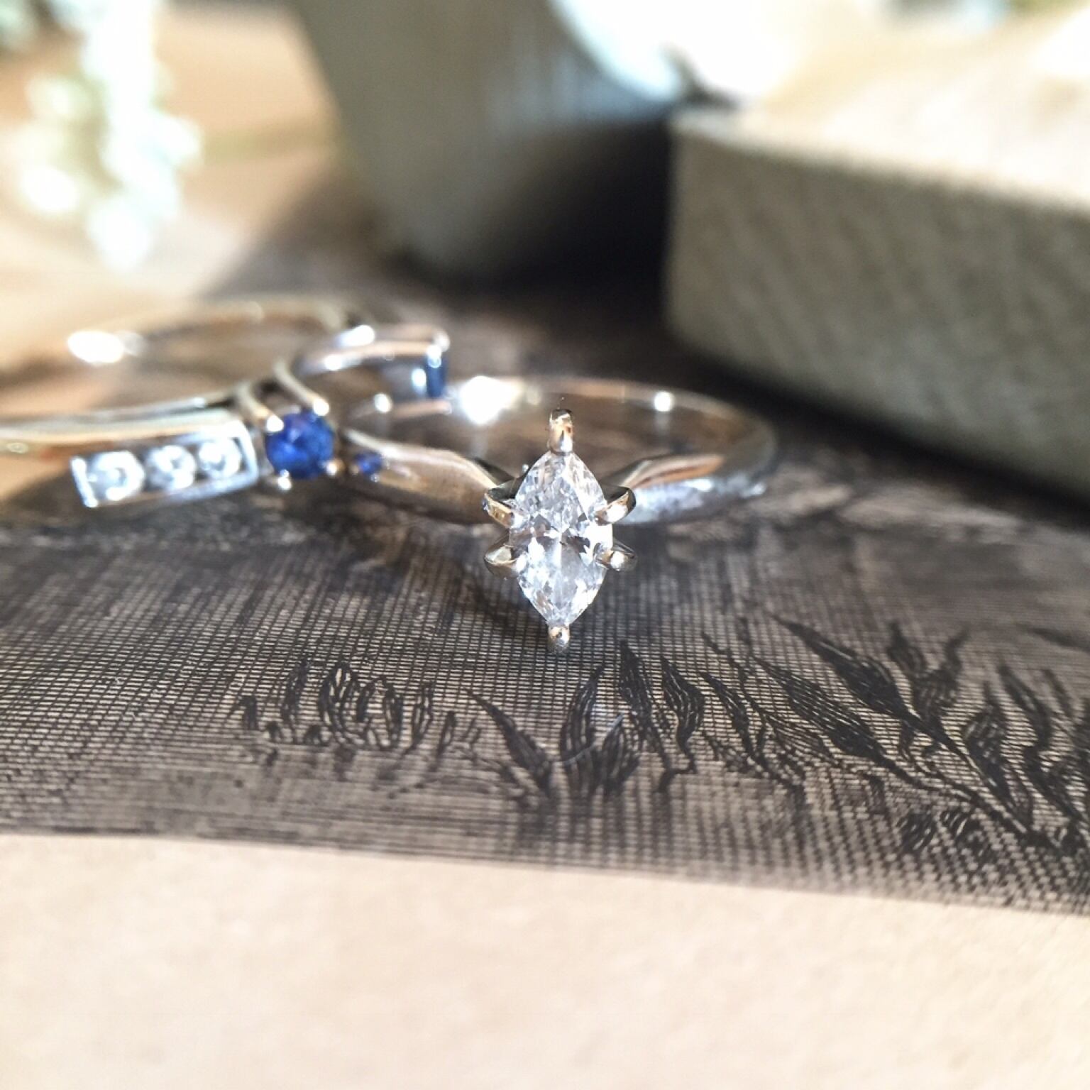 このリングはサファイアとダイヤモンドがセットされたパーツとマーキスダイヤモンドのパーツがそれぞれ取り外し可能で、昼はシンプルな雰囲気で一粒ダイヤモンドリングとして、夜にはサファイアのパーツをプラスしてちょっぴりさりげなく変身♪しちゃえます。