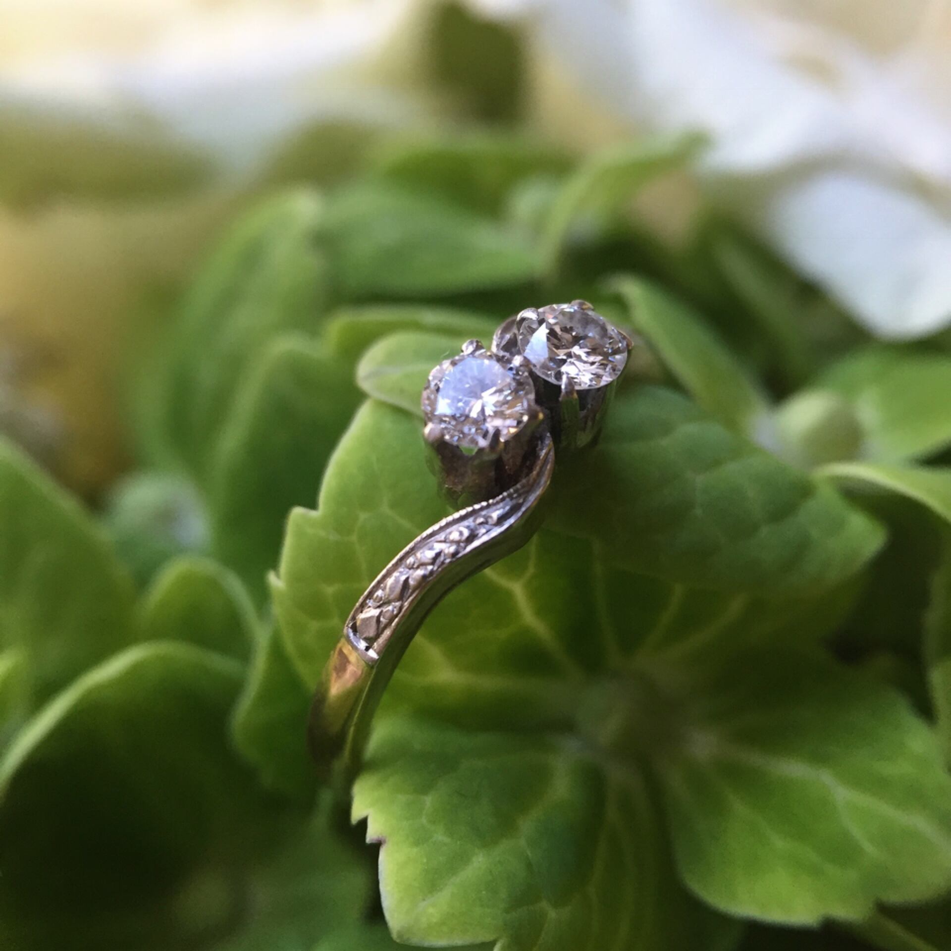 寄り添うように並べられた2石のダイヤモンドは小さいながらも透明感がありしっかりとした存在感もあります。小花に絡むように流れる曲線がダイヤモンドを包み込み、女性らしい空気感と小粒ながらもオールドカットダイヤモンドの煌めきをしっかりと感じる事ができるリングです。