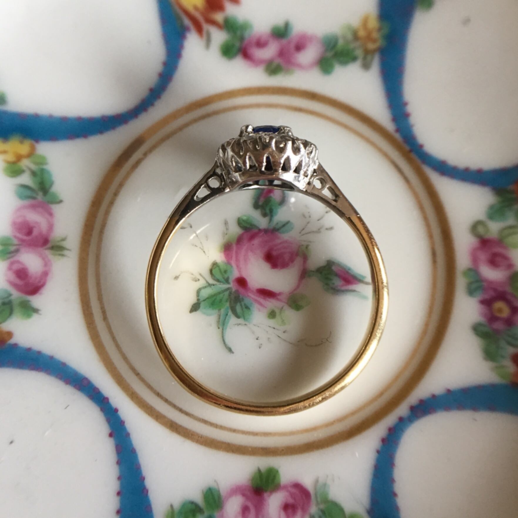 センターにはっきりとした濃い目のブルーサファイアをセットし、その周りを小さい小さいオールドカットダイヤモンドで取り巻いたクラスターリングはアール・デコ期の物。