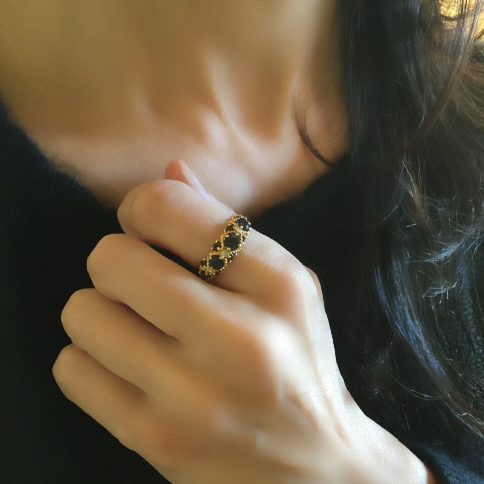 3粒の濃いブルーサファイアをメインストーンに、その合間を埋めるように小さなサファイアを10粒、小さなダイヤモンドを4粒を飾ったブーケのように華のあるファイブストーンリングの変化球版とでもいいましょうか、本当に美しいリングです。
