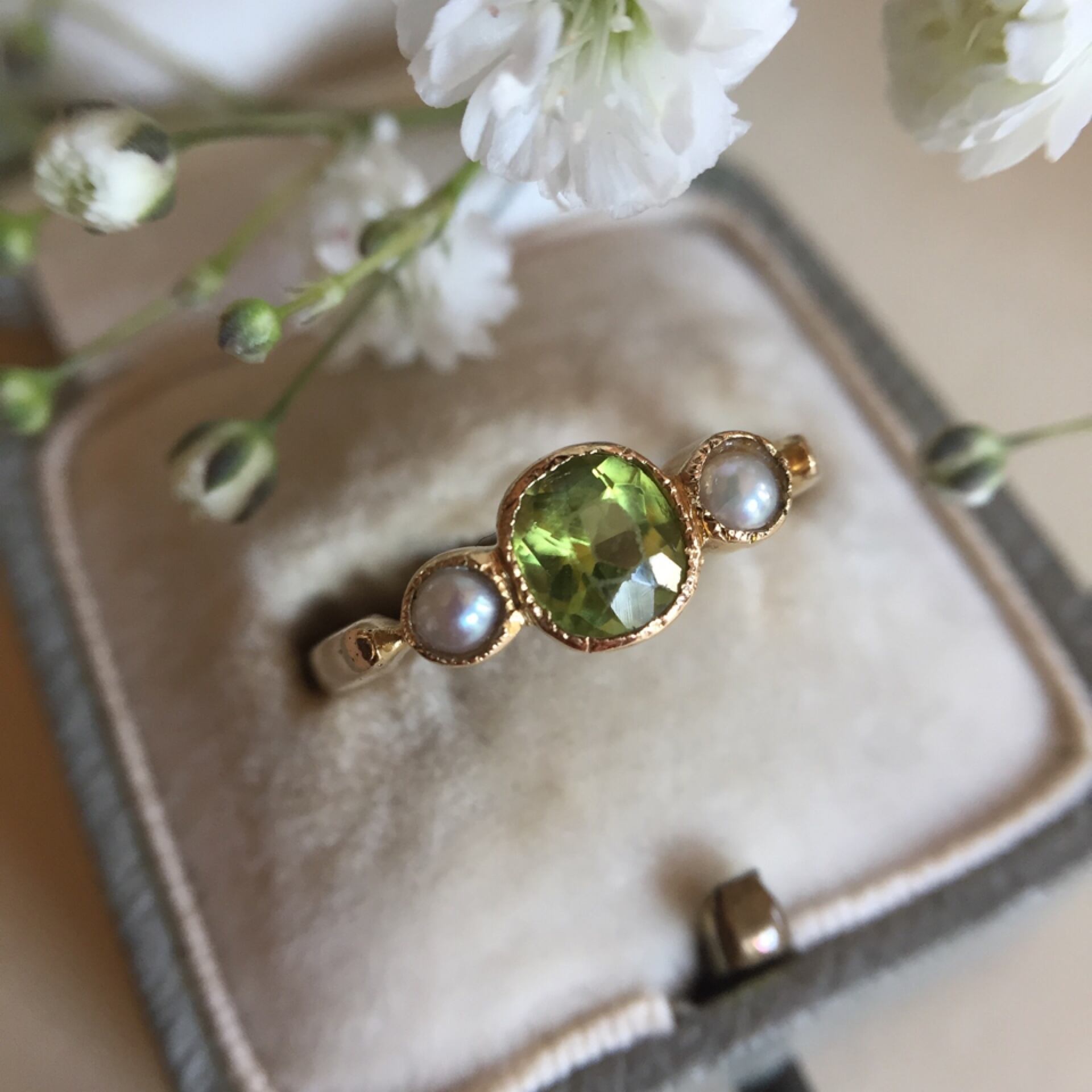 中央に配したぺリドットの両隣りにはシルキーな艶やかな光沢のシードパールがセットされ、その清楚な佇まいが雰囲気にマッチし、春の香りさえも漂ってきそうなリングです。