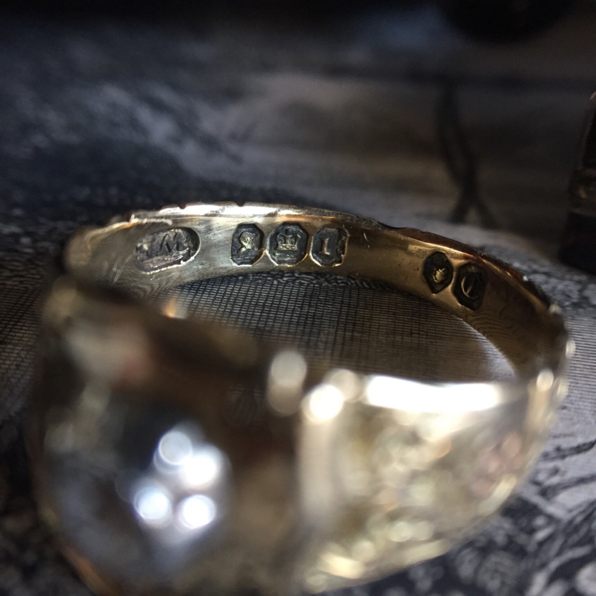 小さいながらも厚みのあるローズカットダイヤモンドが一粒、格式ある風格と共にシルバーの台座に隠れるようにすっぽりと包まれた、古い時代の独特な方法でセットされたリージェンシーからヴィクトリアンに移行する19世紀初期のリングです。