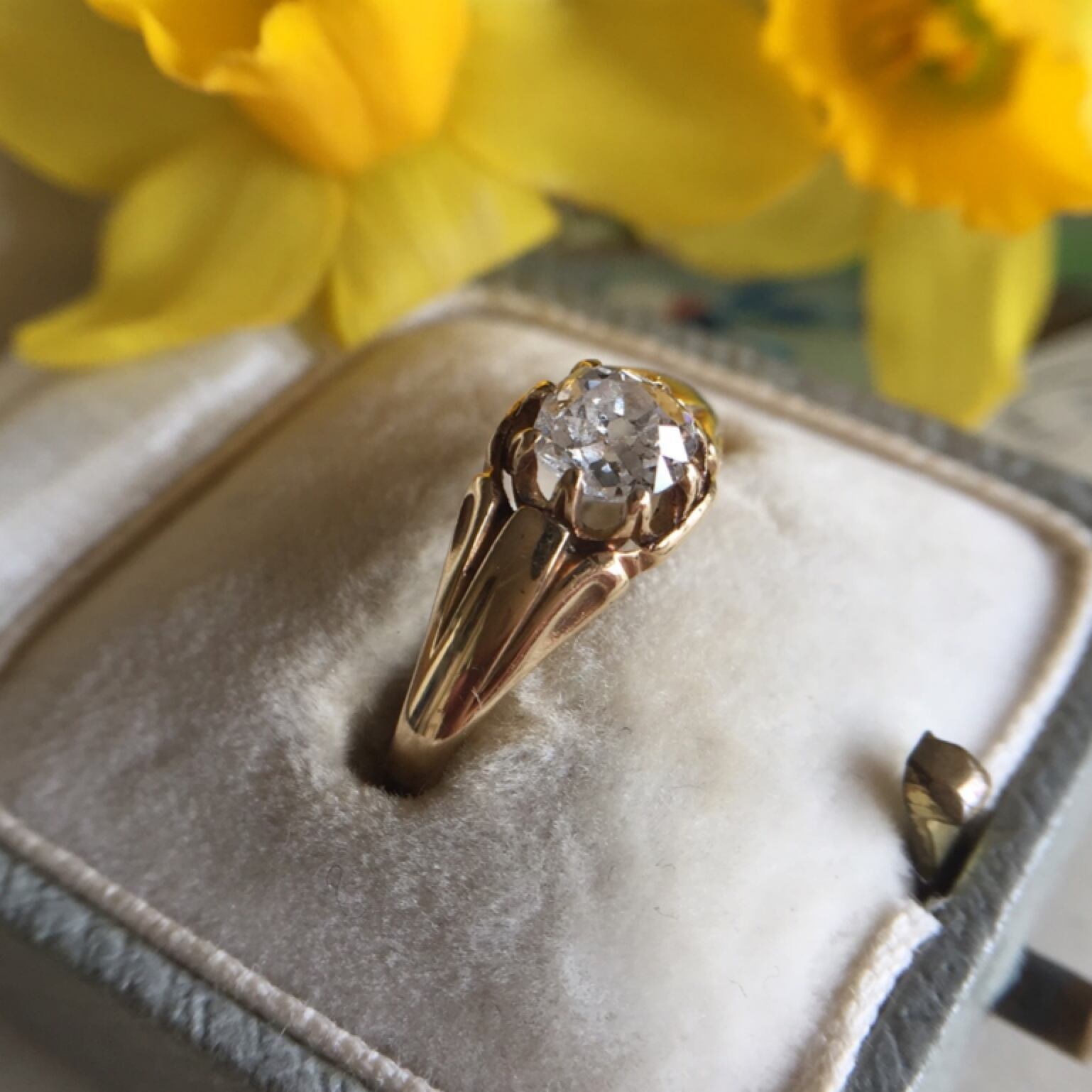 高く伸びた水仙を思わせるシャンクのその先にはオールドマインカットダイヤモンドがセットされたヴィクトリアンソリテールリング。