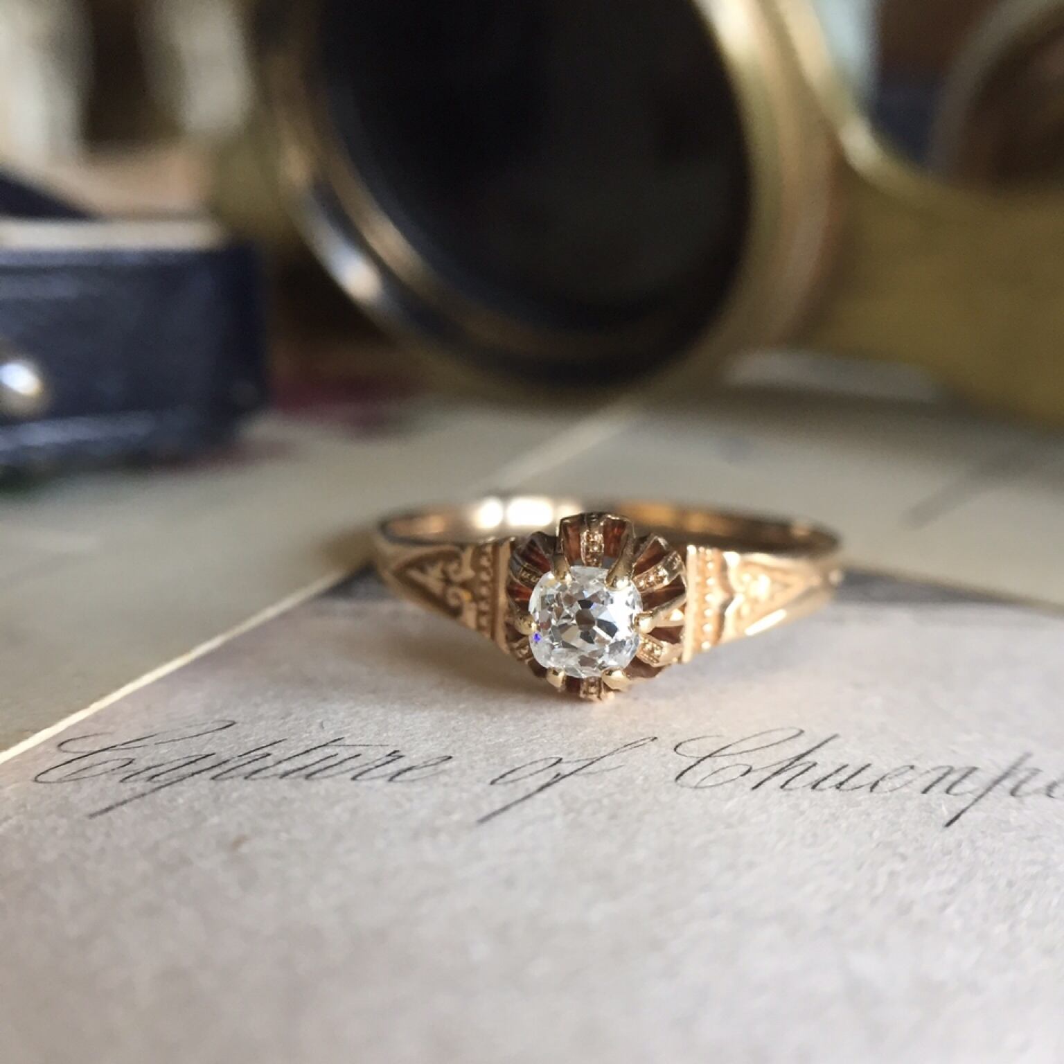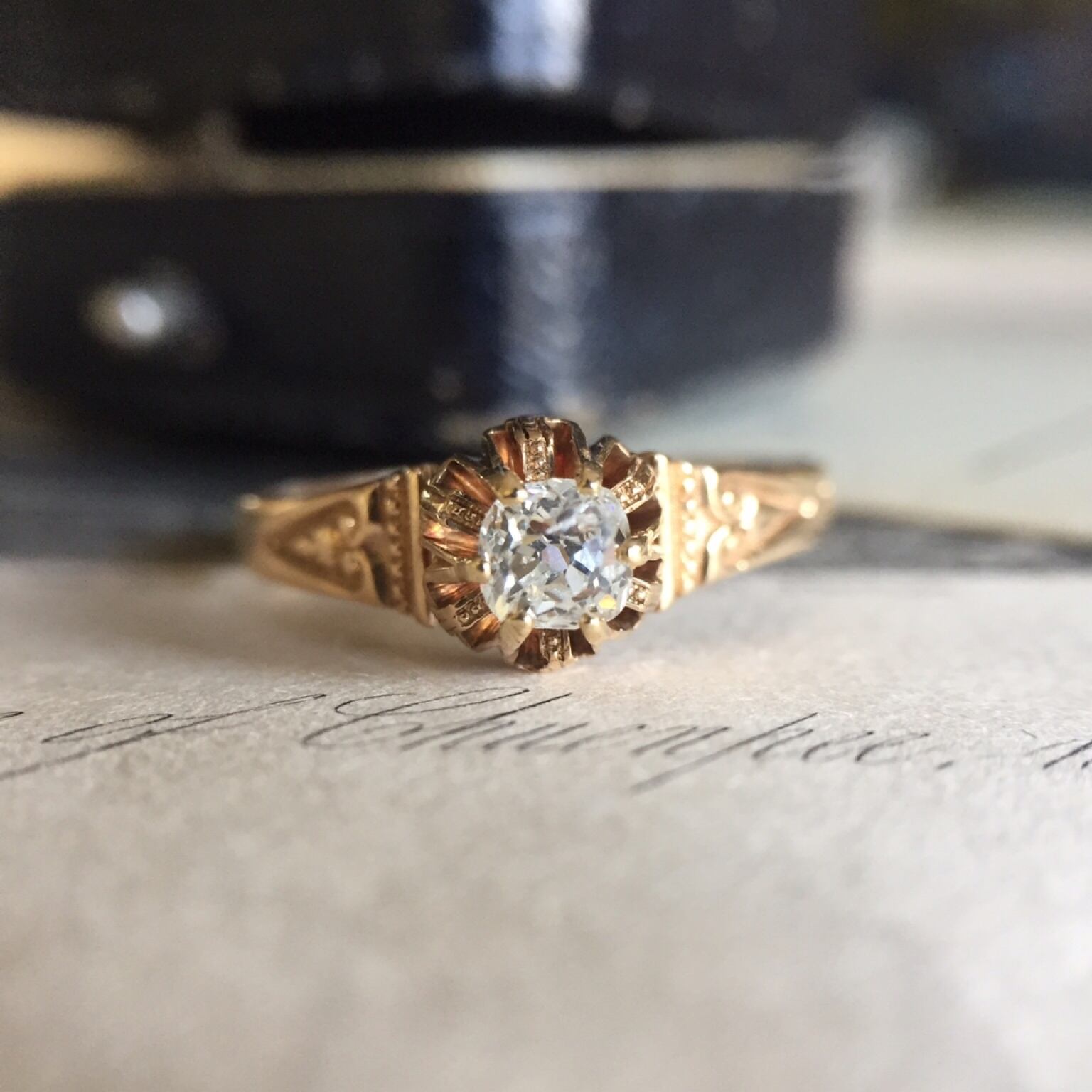 オールドマインカットダイヤモンドがセットされた爪の交互のデザインの内側にカールされている方の爪には装飾までもがなされ、ショルダー部分にはギリシャの柱を思わせる古典的な彫りが施され、なかなか見ないタイプのヴィクトリアンリングです。