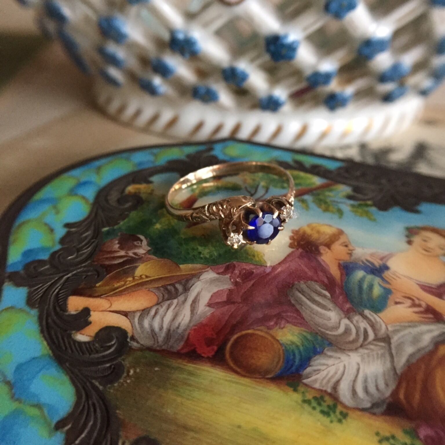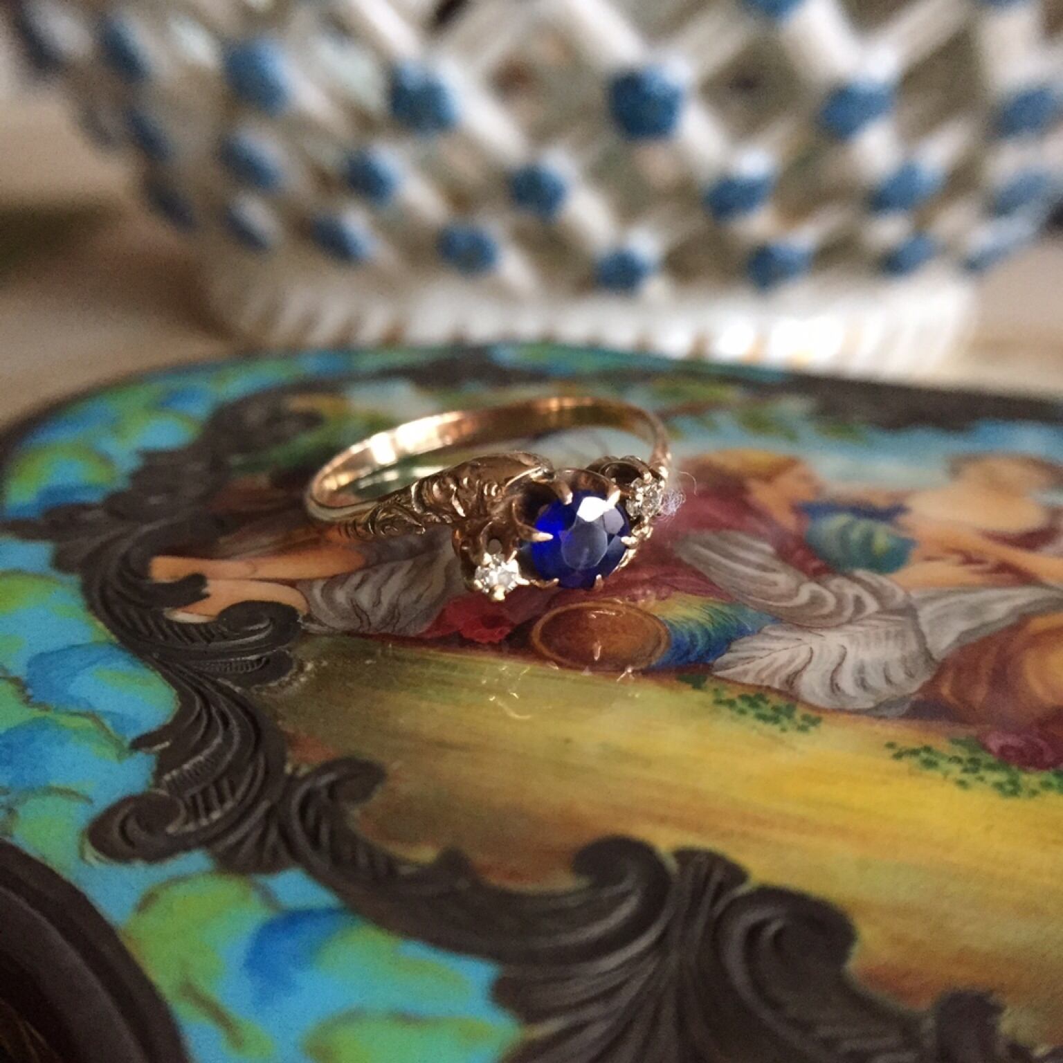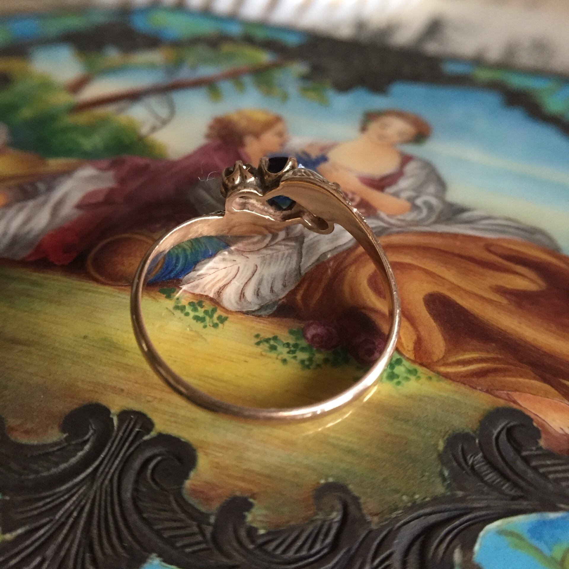 アシンメトリーなシャンクの曲線の先に上品に佇む優しい雰囲気のサファイアとダイヤモンド。その時代のヴィクトリアンリングの特徴的なデザインが本当に美しいリングです。
