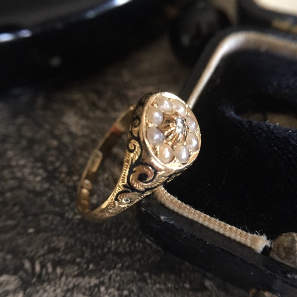 クローズバックのしっかり台座にセットされた小さなローズカットダイヤモンドの周りを8粒のハーフパールが繊細に佇み、色味の違いがかすかに見られる、アンティークならではの表情をみせてくれます。