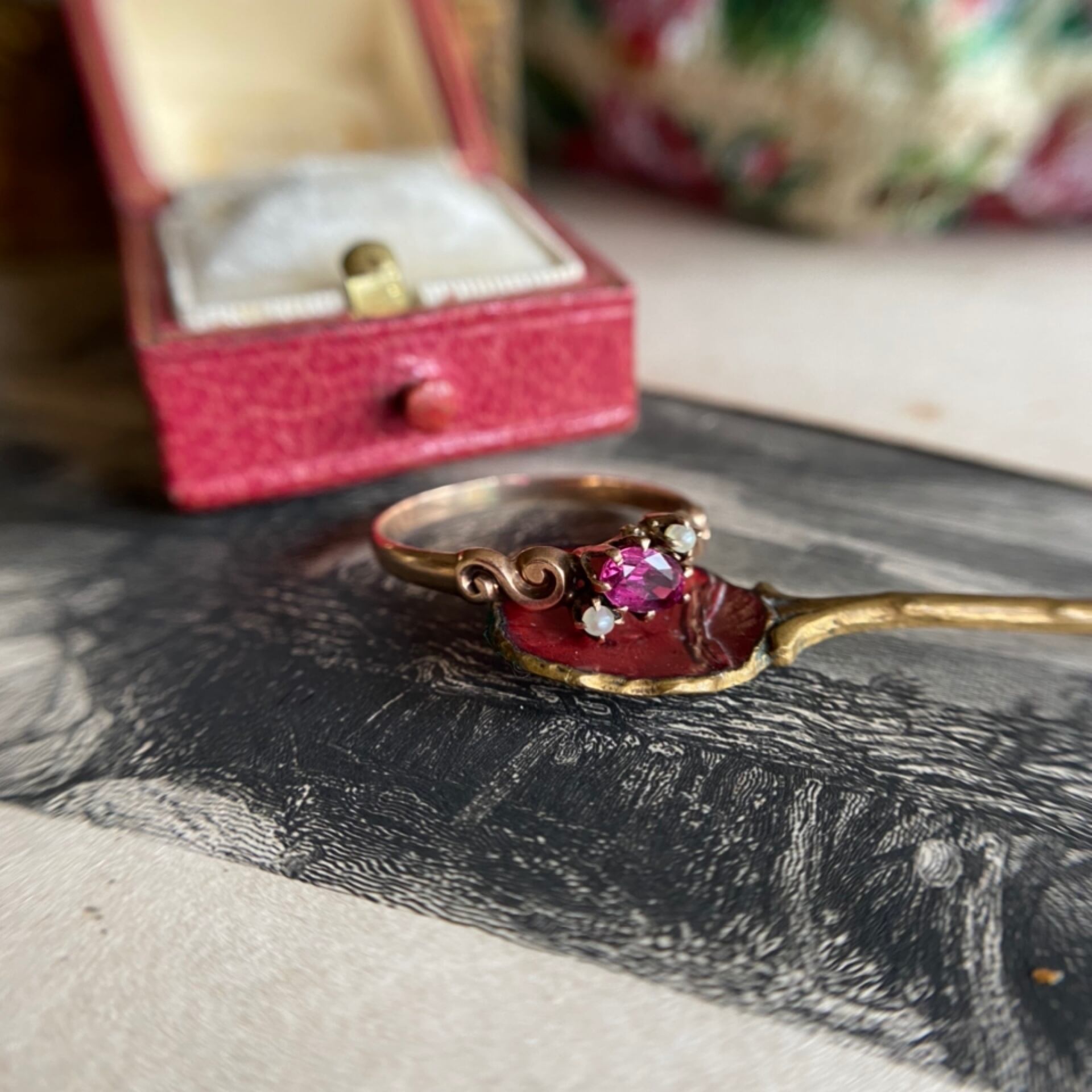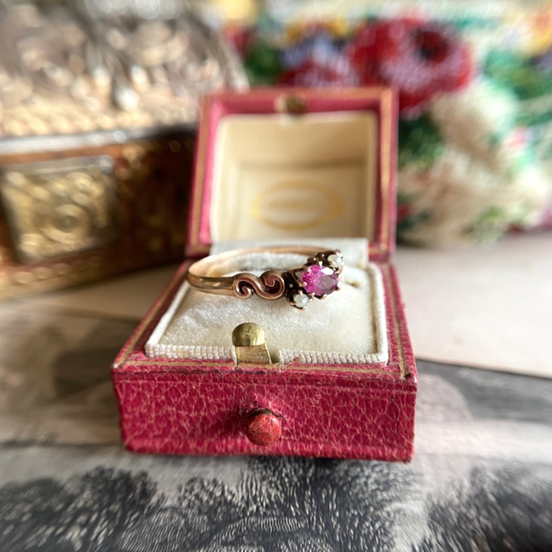 明るいピンクのルビーが密やかな甘さを楽しむ大人の為の愛らしいヴィクトリアンリング。