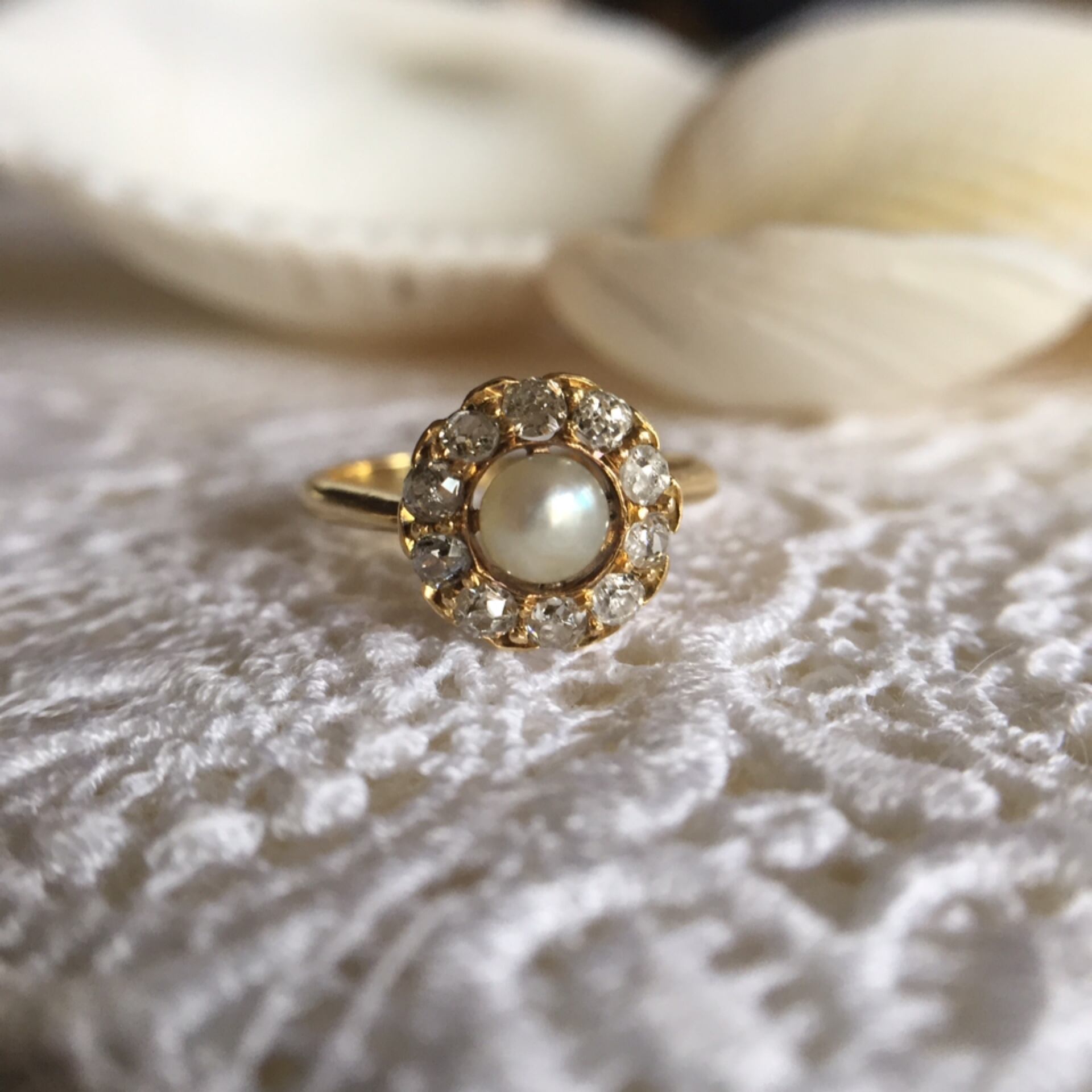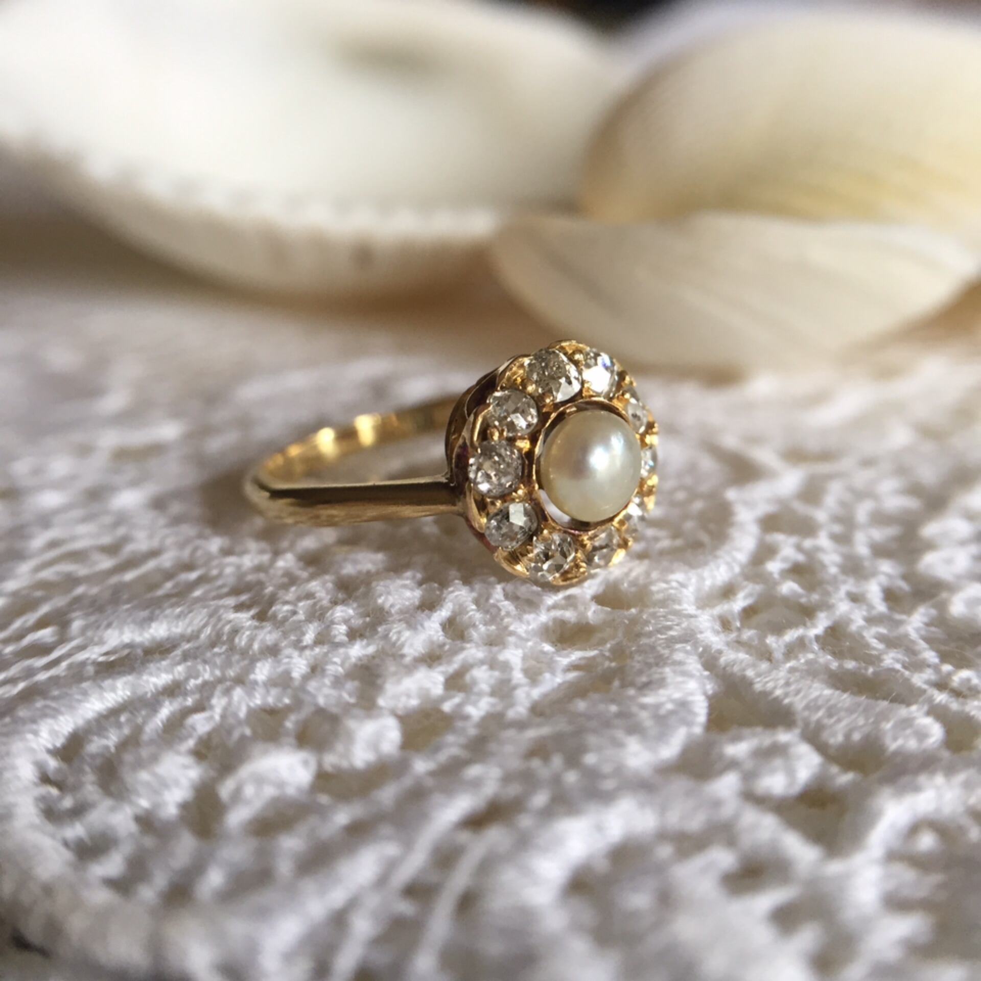人工的な真円ではない、やや平らめな自然な形もつ柔らかな光沢と艶やかなクリミー色の約4mm程のパールを、10石のオールドマインカットダイヤモンドがとりかこみ、小さくても、しっかりした輝きが本当に美しくもあり可愛らしくもあるリングです。