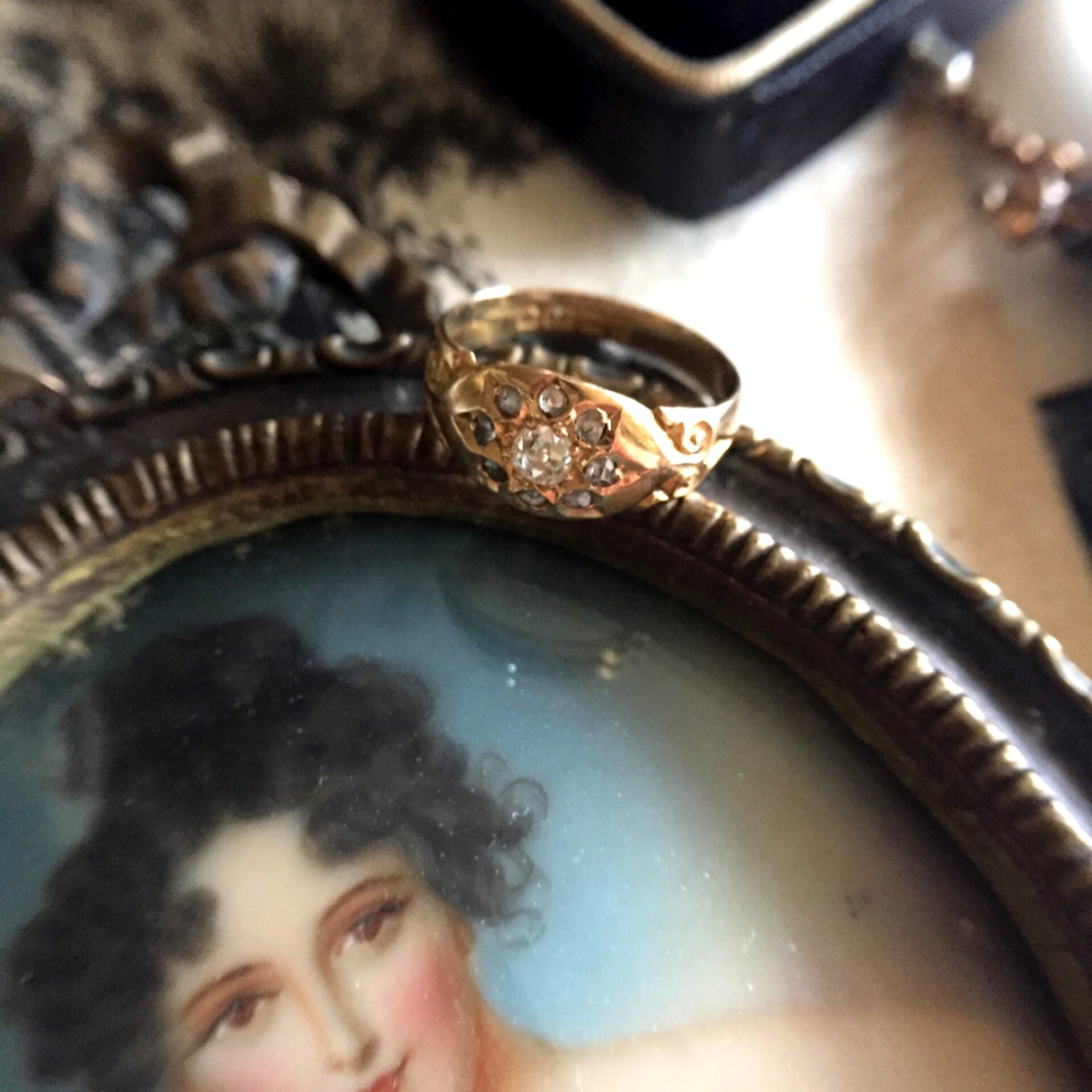 日差しを浴びる向日葵のようにダイヤモンドがカチカチと共鳴し18kゴールドの輝きと共に落ち着きのある上品な光を放ち、中央の3.5mmほどのオールドマインカットダイヤモンドの周りを8粒の荒削りされた小さなダイヤモンドが取り囲み、鏨で刻んだフェイスの表情に手彫りのアンティークらしい深みを感じます。