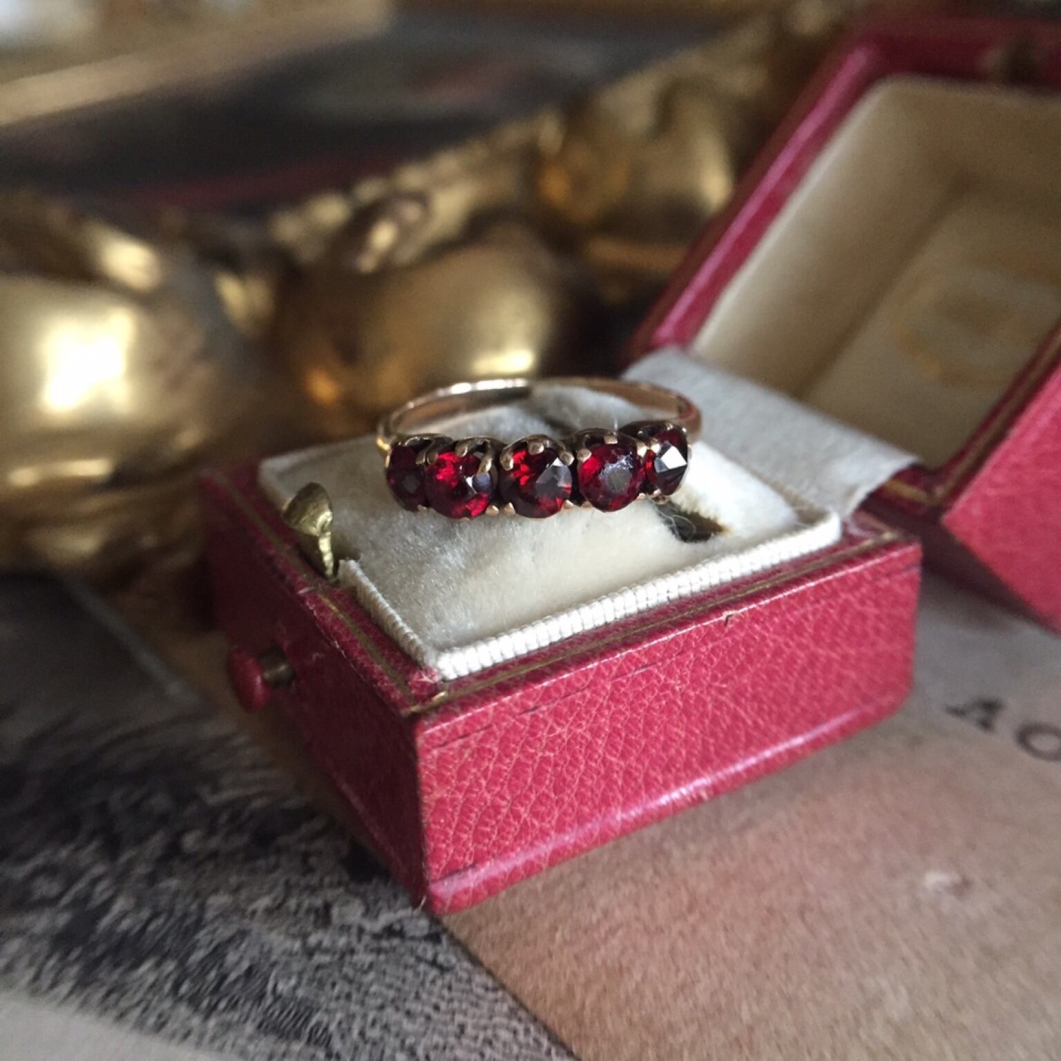 ガーネット5石が一文字に並んだシンプルでアンティークジュエリーならではの王道を行くデザインのヴィクトリアンリング。