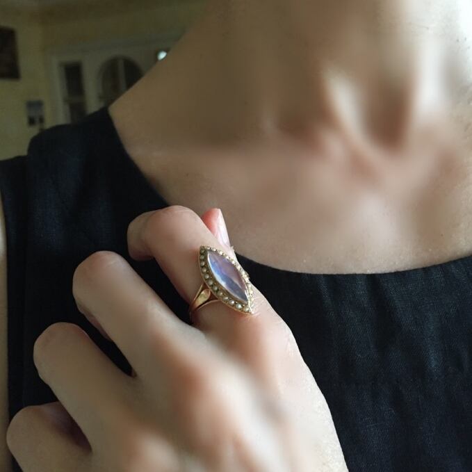 絹のような艶が美しく繊細にセットされたシードパールの微かに異なる不揃いな色みの違いが、反射する光にアンティークならではの表情を与え、シードパールがあることにより、ムーンストーンの妖艶な美しさにホッとする柔らかな可愛らしさをプラスしてくれてる明るくフェミニンな印象のリングです。