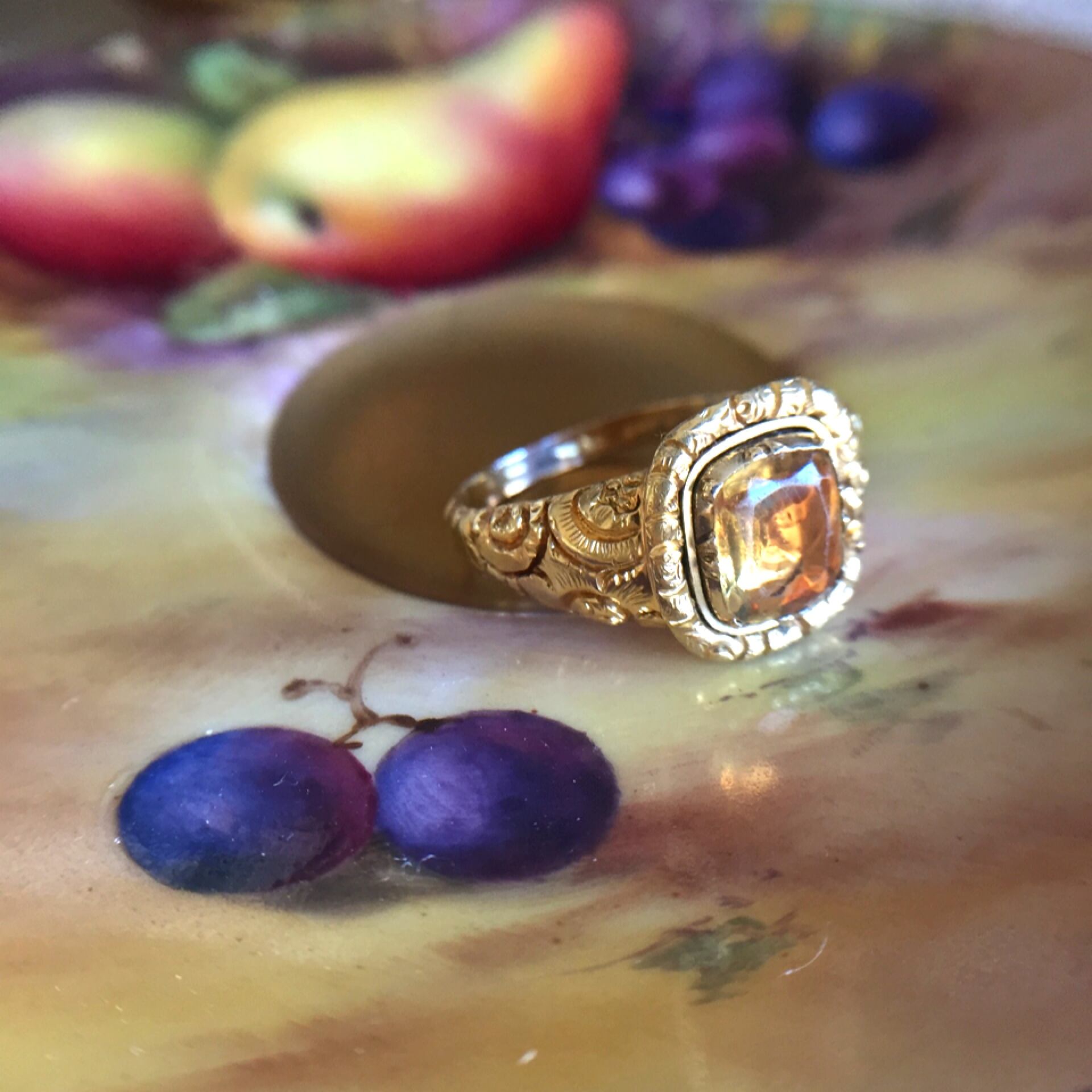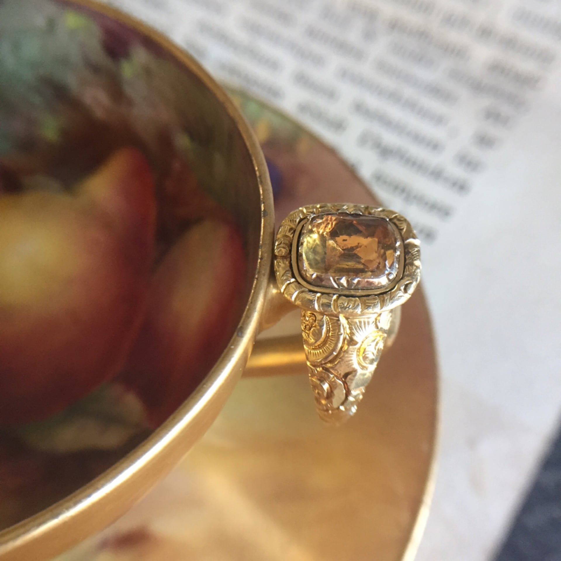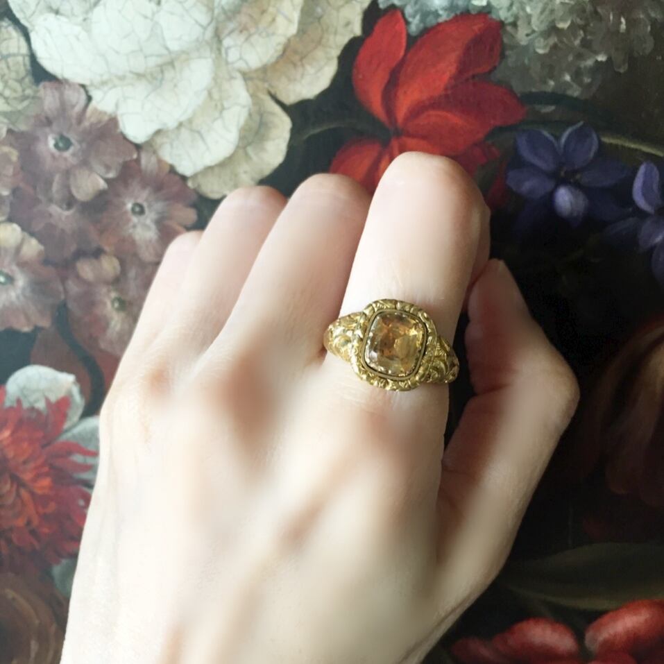 ゴールドが硬い素材という事を忘れてしまうくらいに見事なゴールドの細工技術にシトリンが溶け合い、この時代ならではの美しさが詰まったリングです。