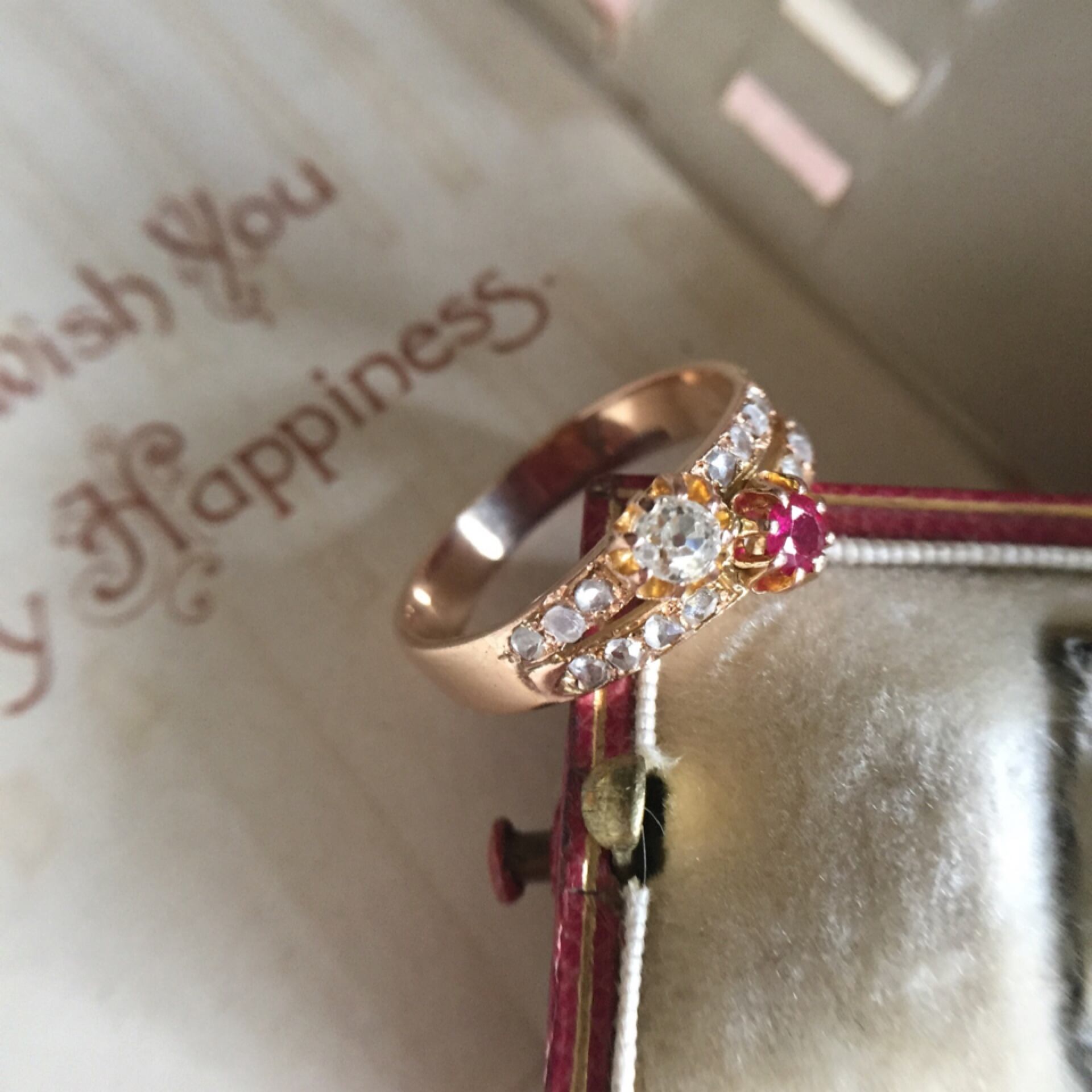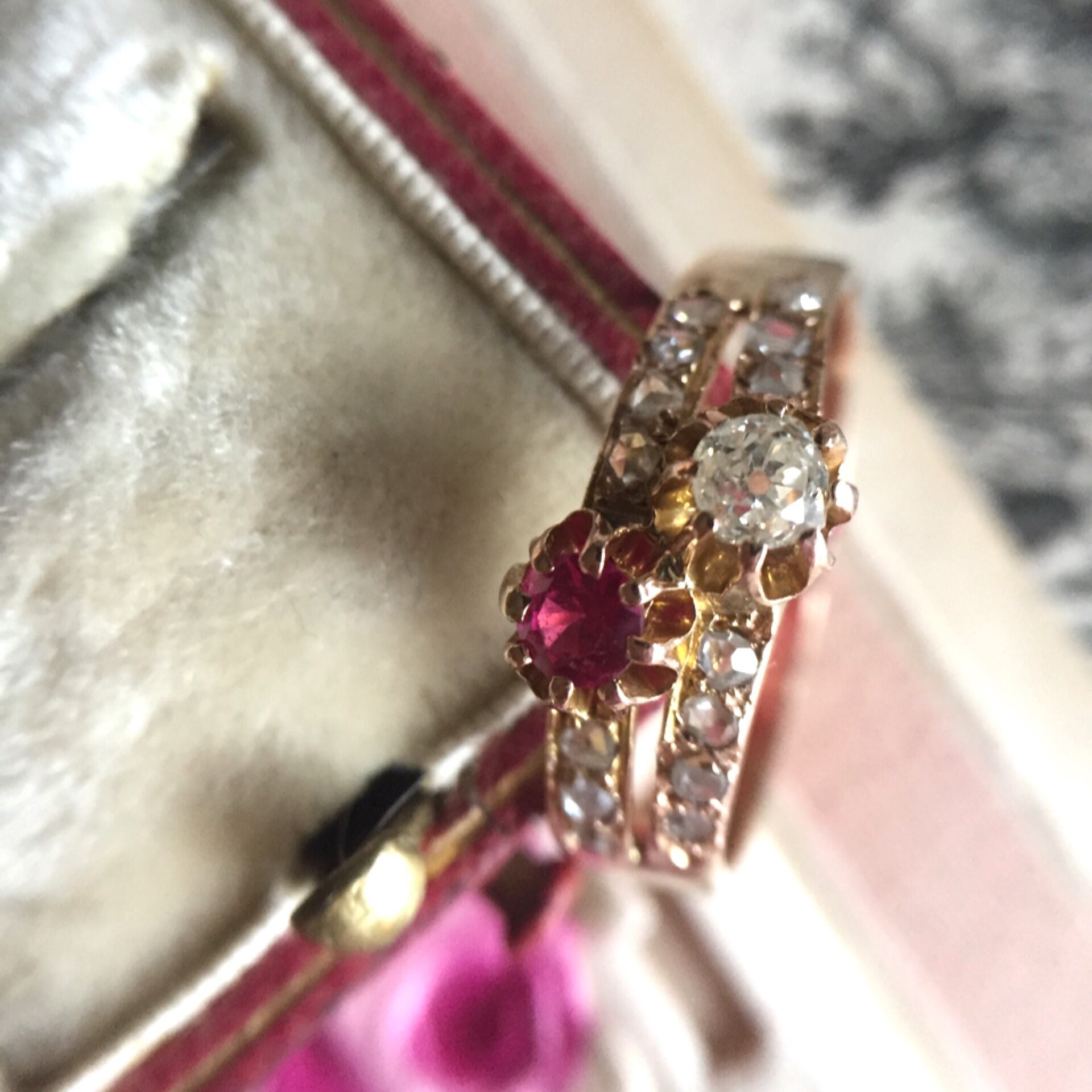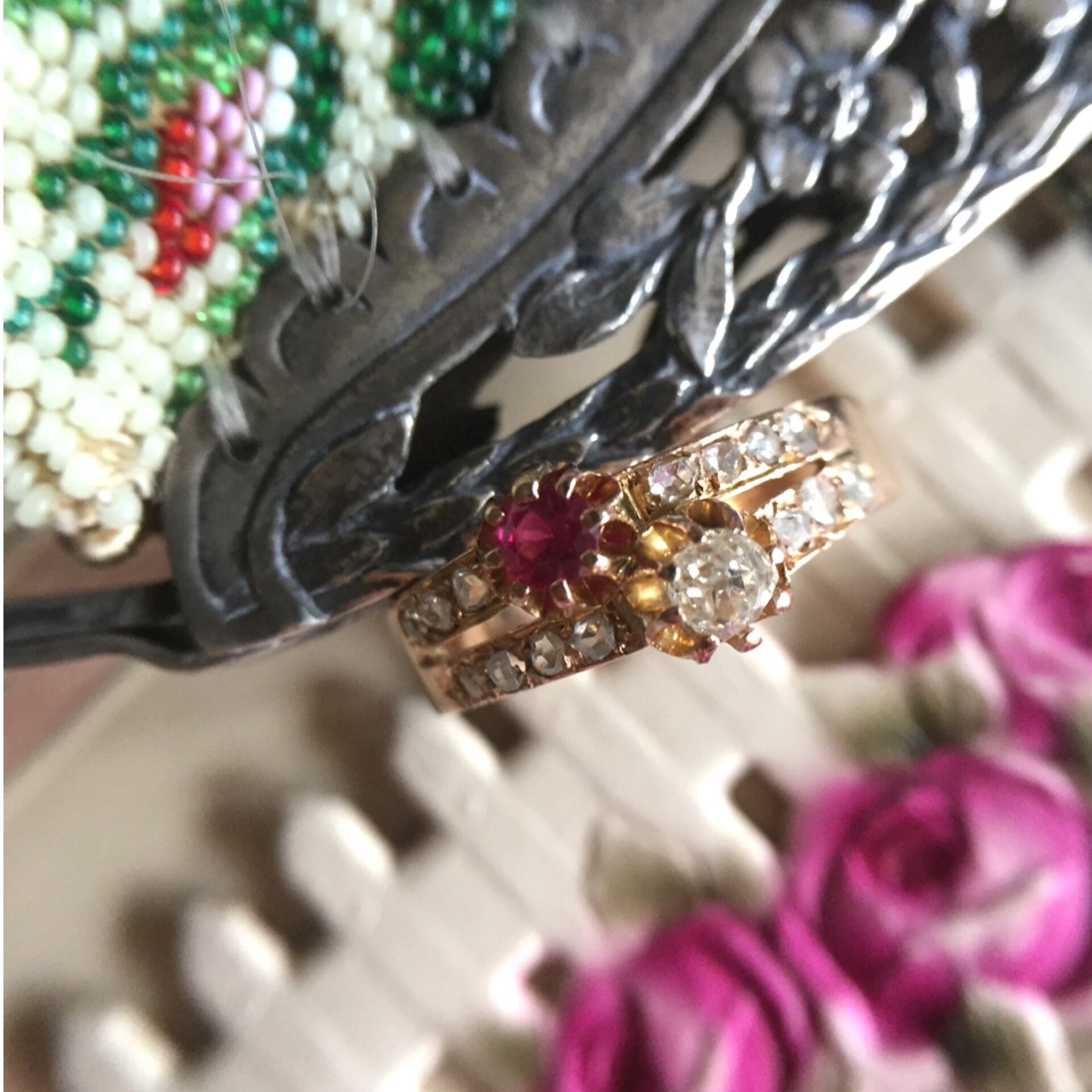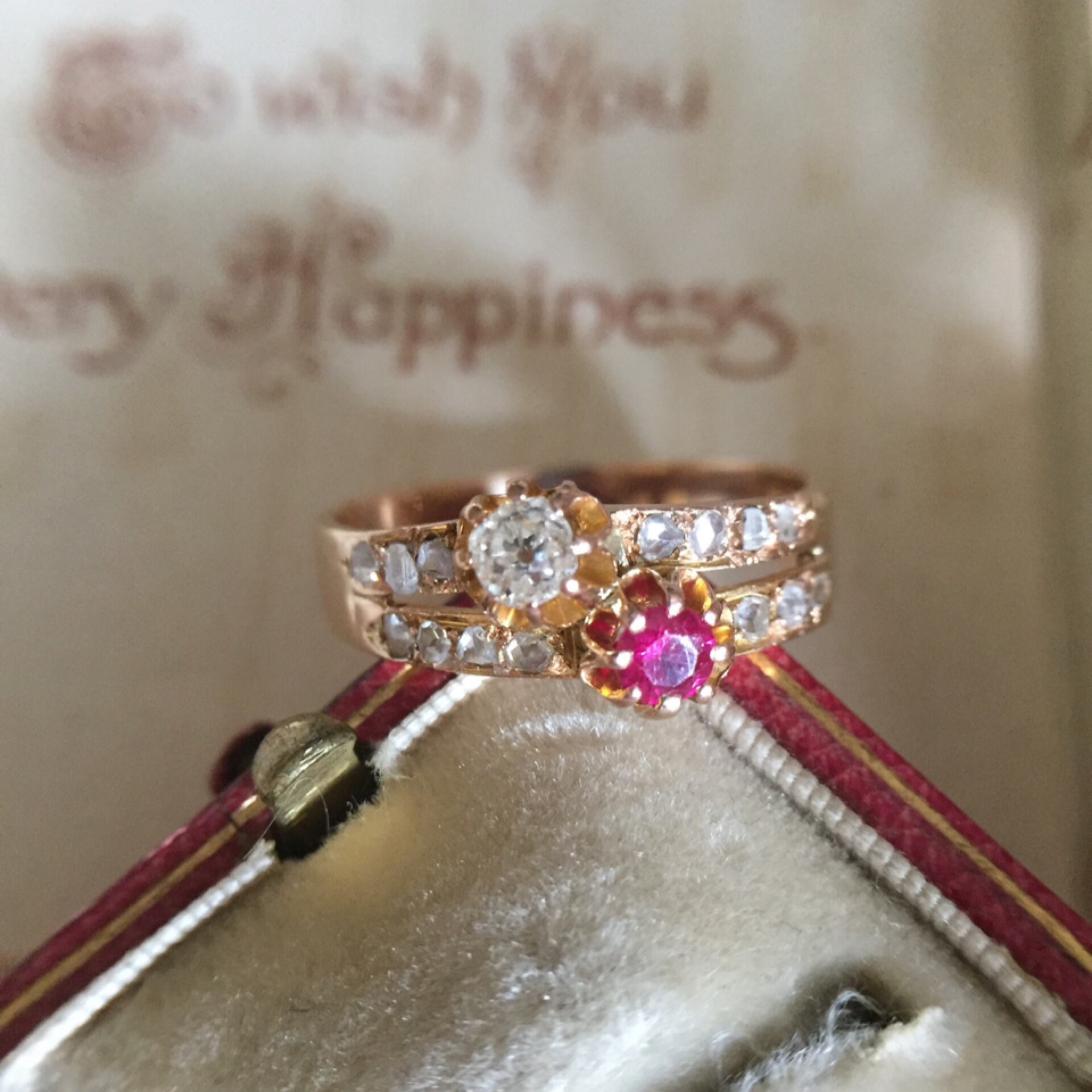 こうしたふたつの石を組み合わせた物は永遠の愛を象徴するリングとして当時は婚約指輪として人気がありました。