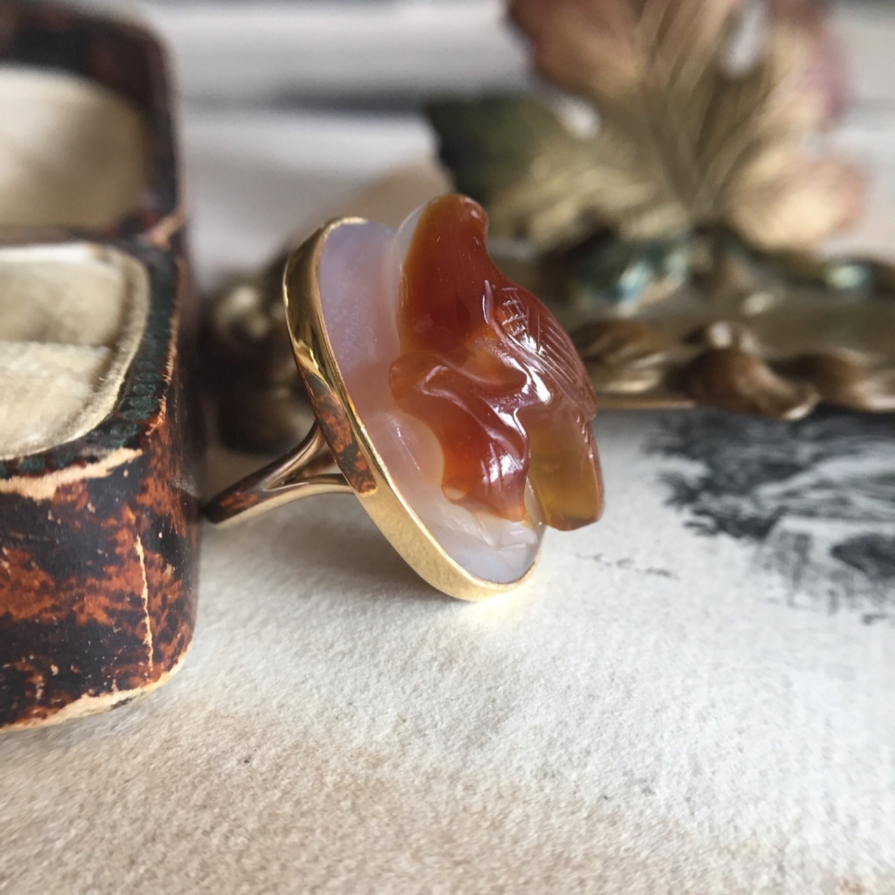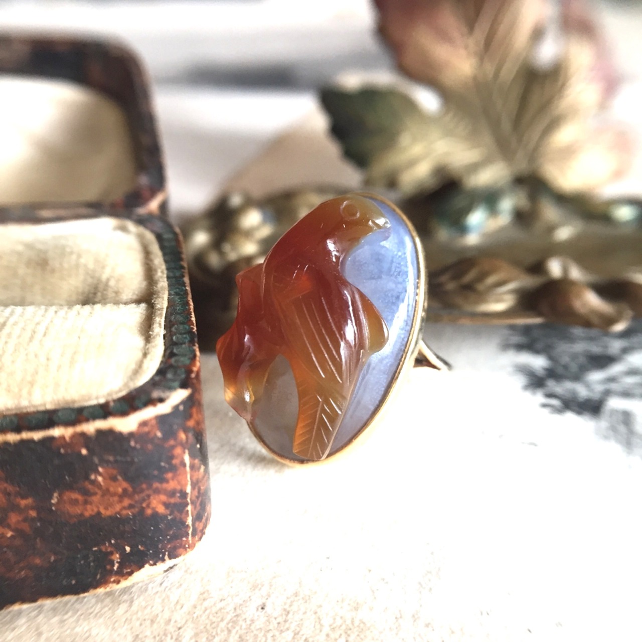 青みを帯びたクリーミーな乳白色のベースカラーから浮かび上がる透き通ったブラウンオレンジの温かみのある色合いのサードオニキスのツバメのリング。