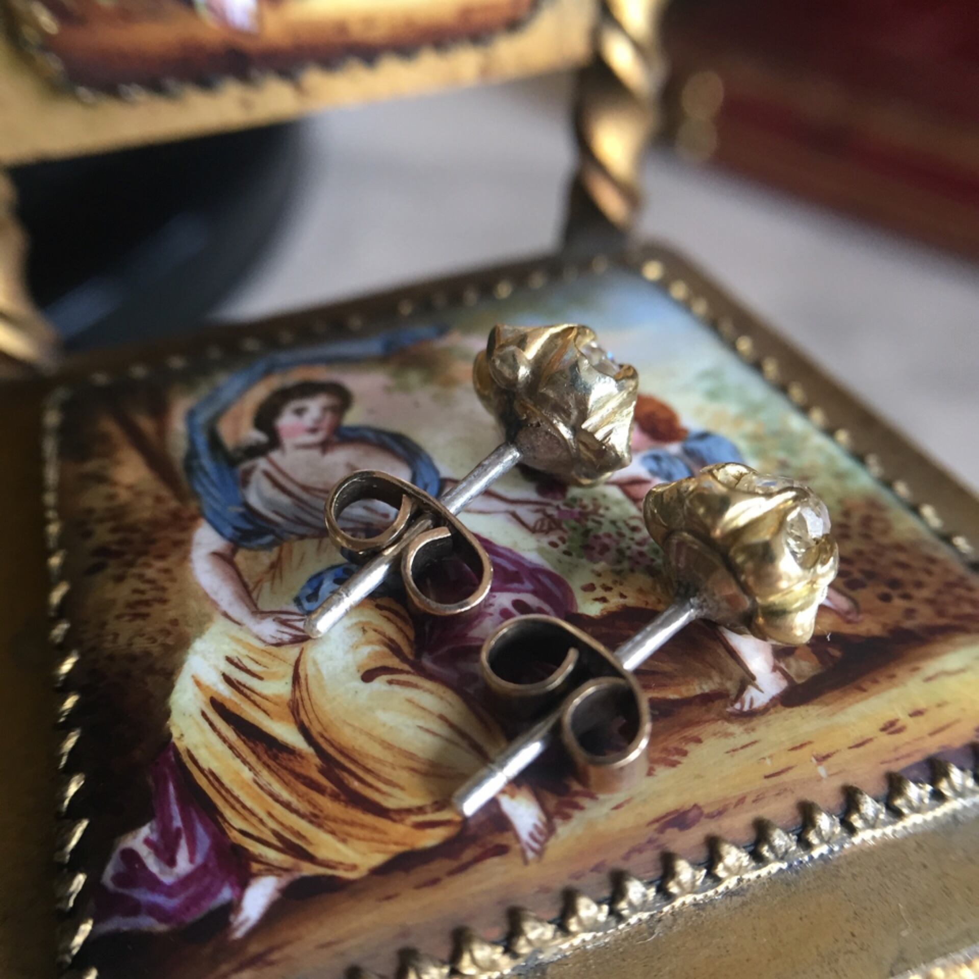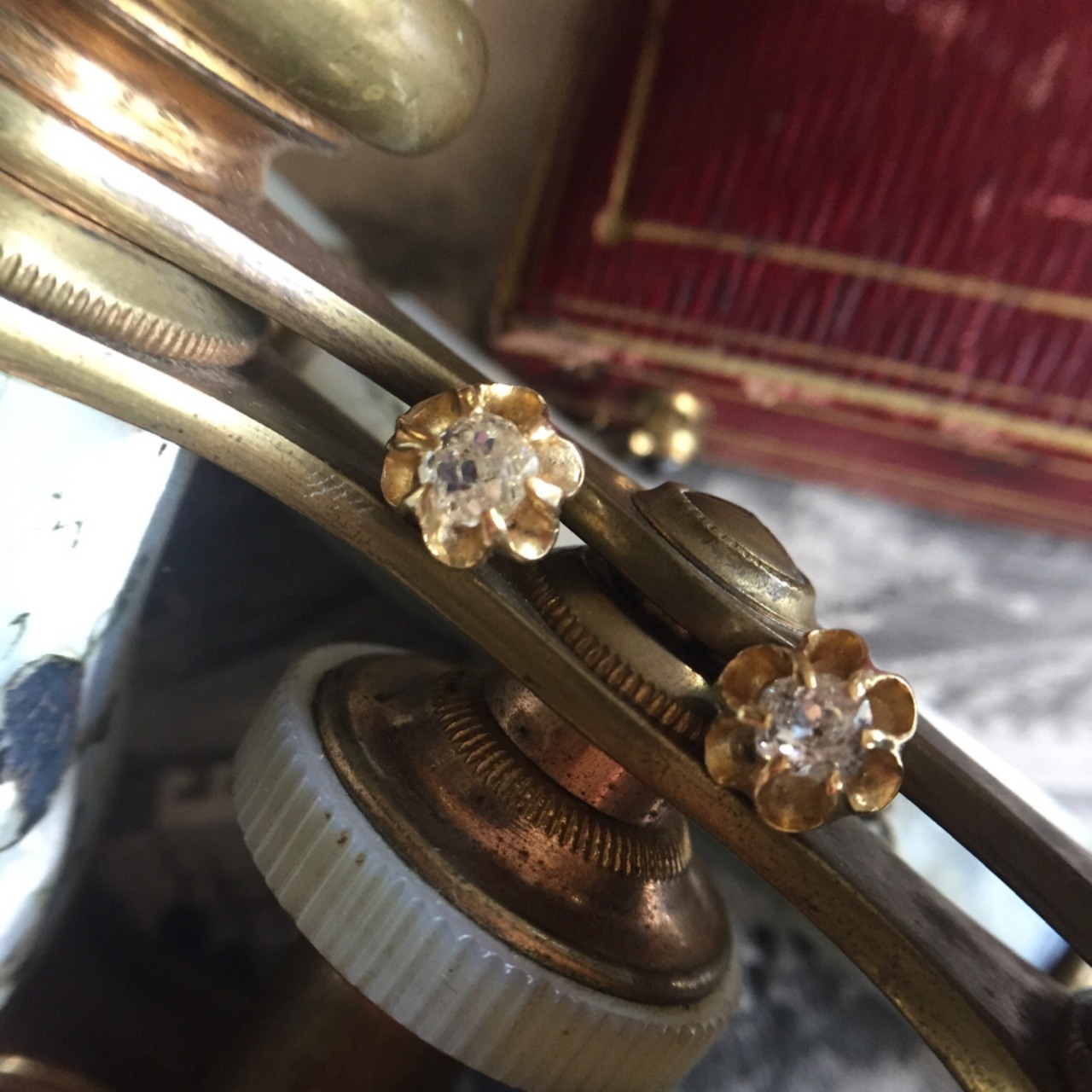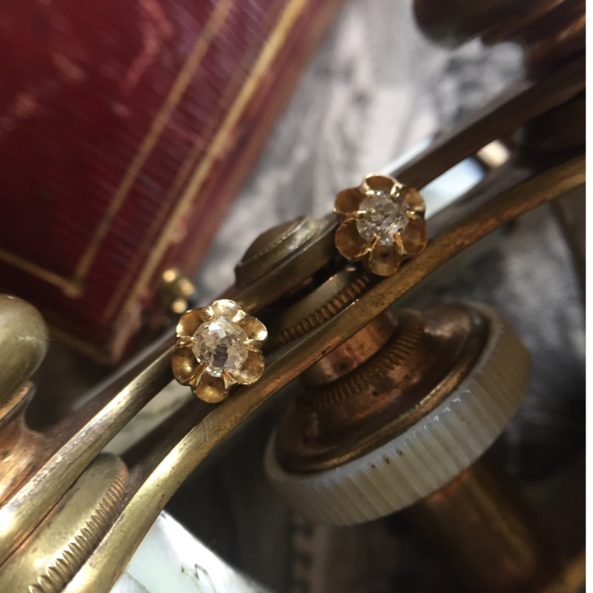 お花をモチーフにしたバターカップセッティングに透明度が高くて美しいオールドマインカットダイヤモンドをあしらったピアス。