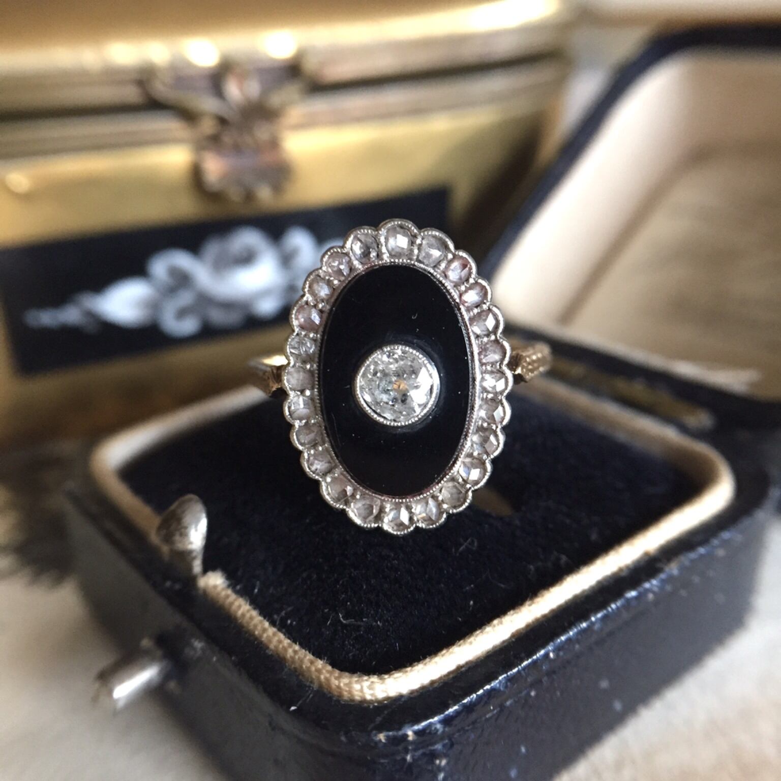 オニキスの黒とダイヤモンドの白の輝きの組み合せはアール・デコ時代によく使用されてきましたが、こちらのリングはその時代よりほんの少し前の1910年頃のエドワーディアンのお品と推測されます。
