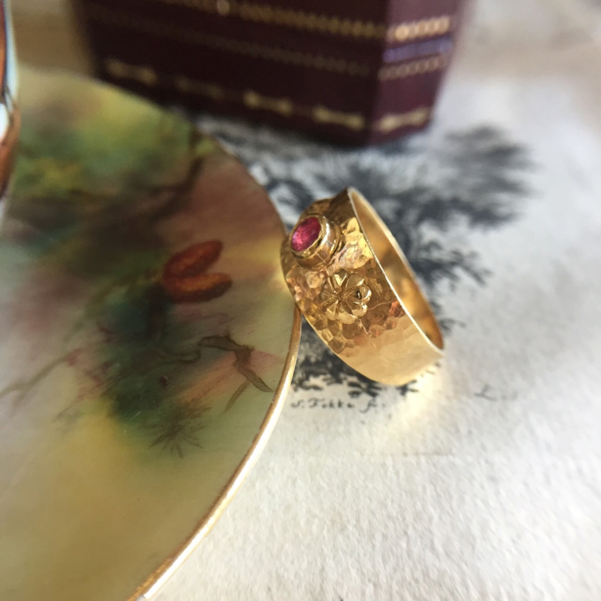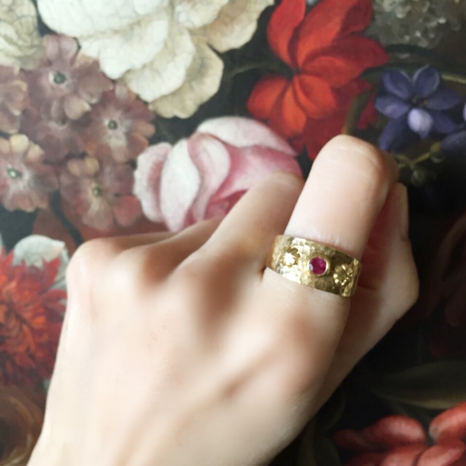 ハンマーワークでできた微かな凹凸の陰影に光が反射しハンマーワークの数ぶんの輝きが織り成す光と影が美しい18kゴールドのルビーバンドリング。