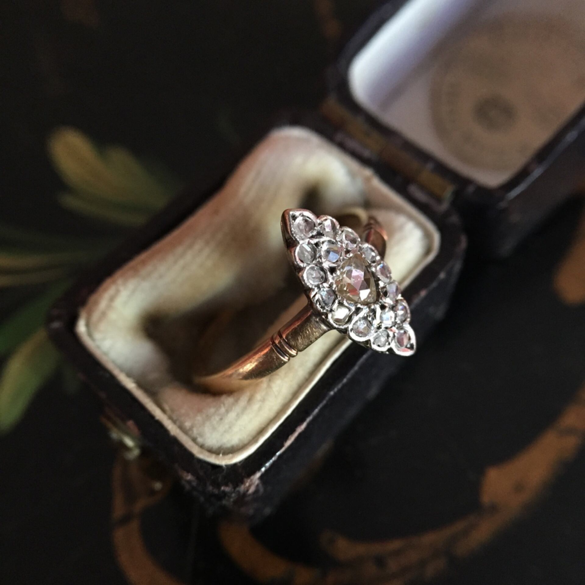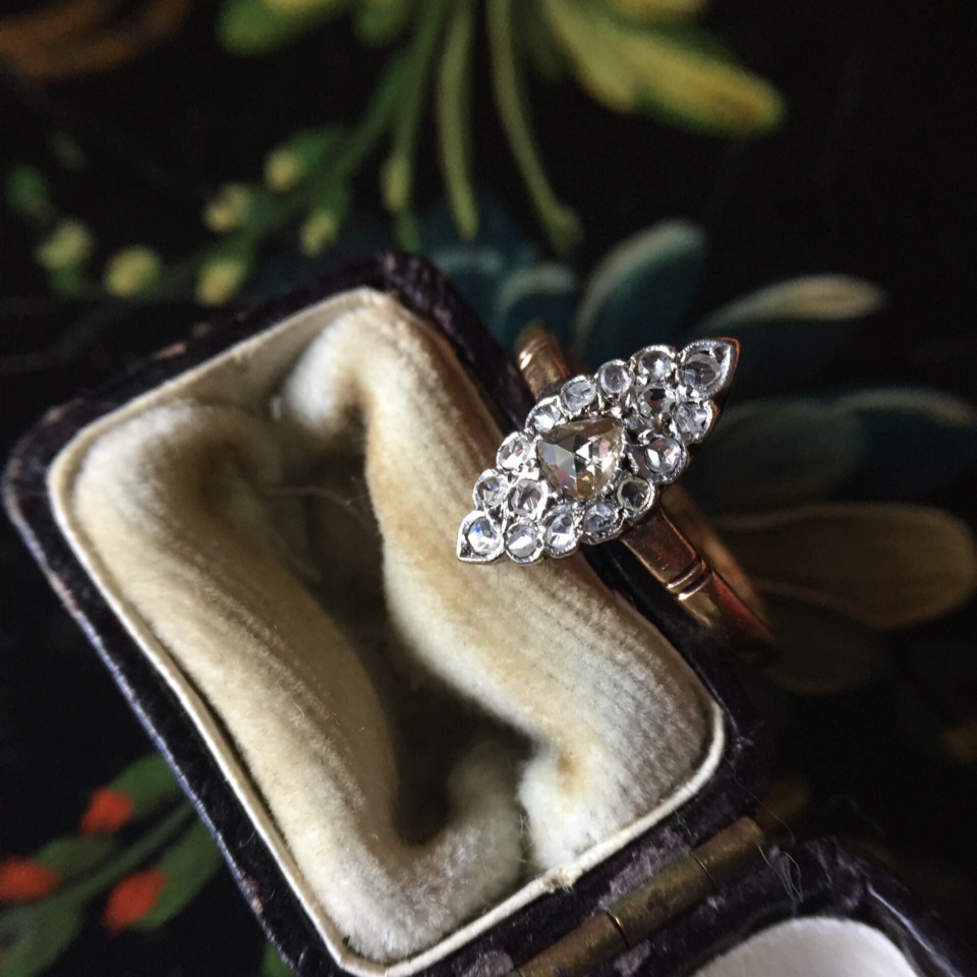 マーキーズシェイプに敷き詰めたローズカットダイヤモンドがカチカチとした輝きを放つヴィクトリアンリング。