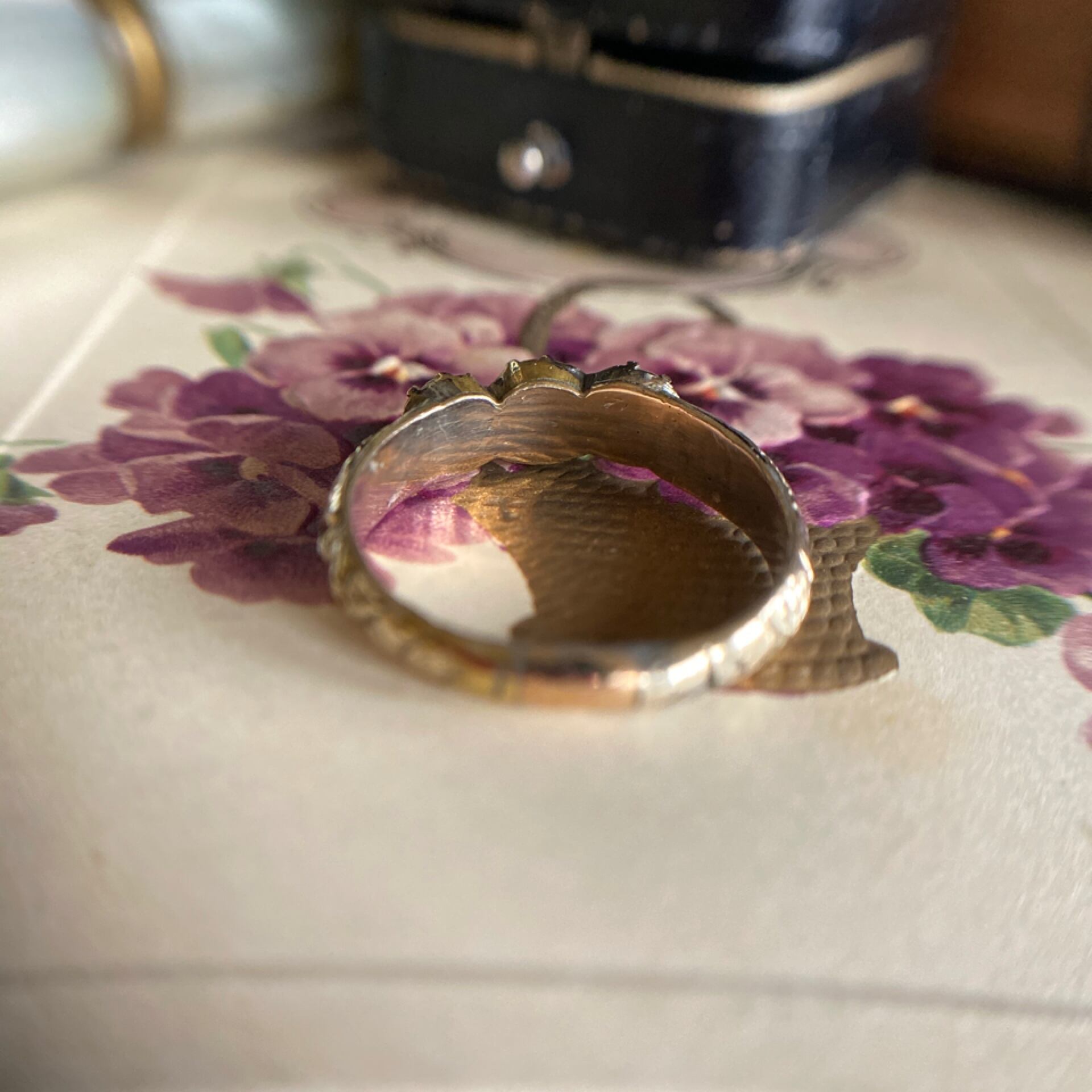 スミレのような優しい色合いのパープルカラーのペーストガラスの両隣りに200年の時の中で、表面はいくぶん時を経てきた雰囲気がかえって美しさとなって見えるナチュラルパールを添えたジョージアンリング。