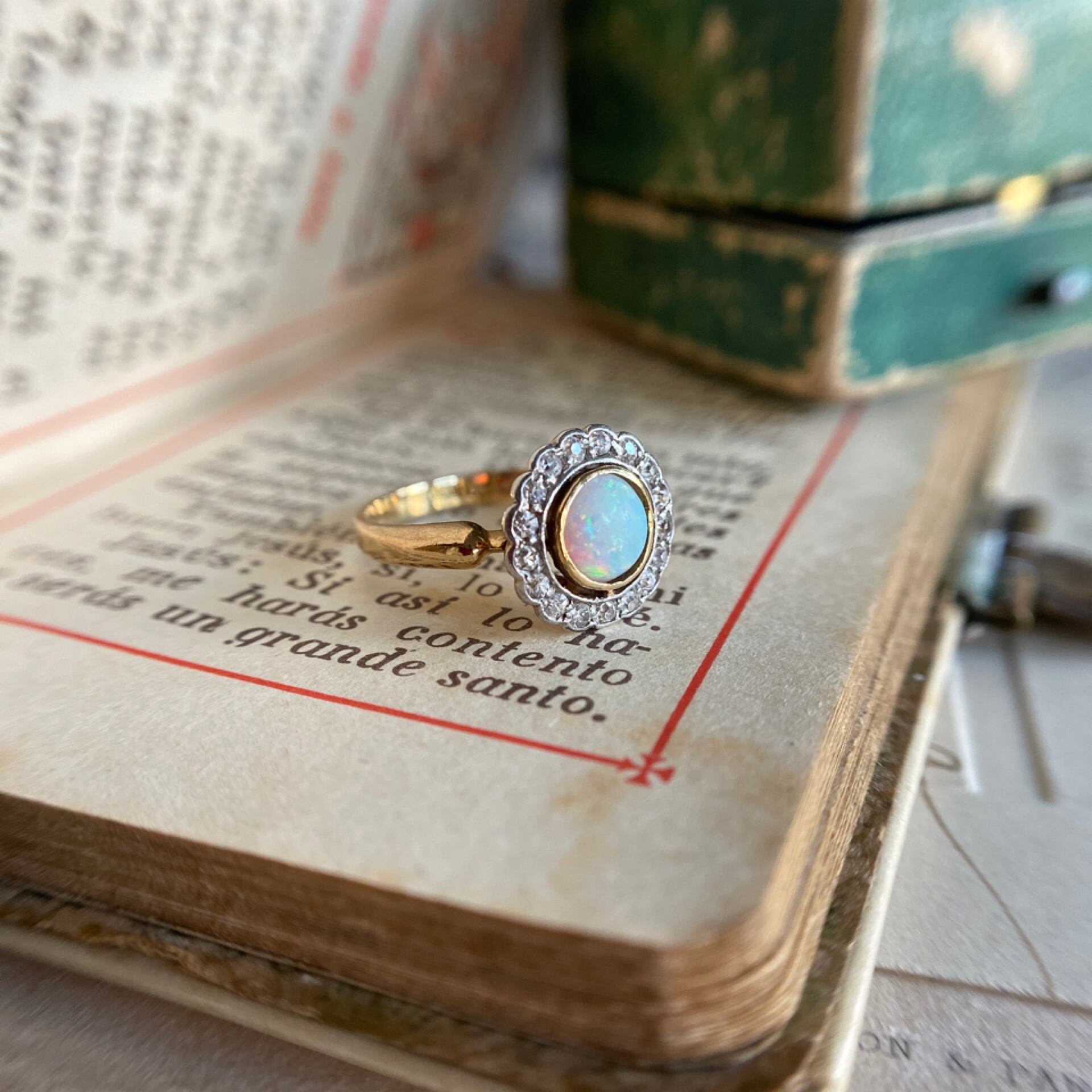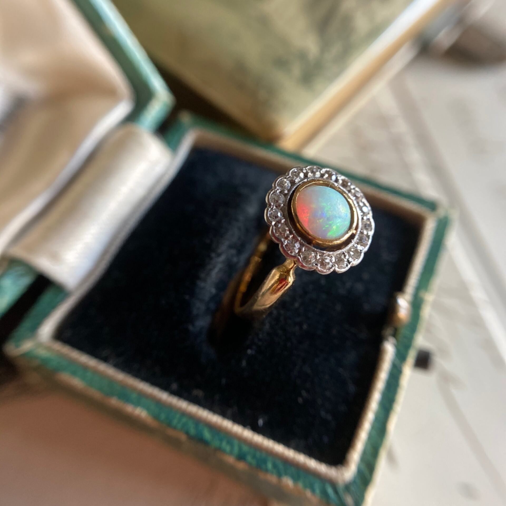 18カラットゴールドのシンプルで華奢なシャンクに浮かび上がる瑠璃色のオパールは現代にはない柔らかな光沢で神秘的に輝き、20世紀初頭のエドワーディアンムードに溢れたリングです。