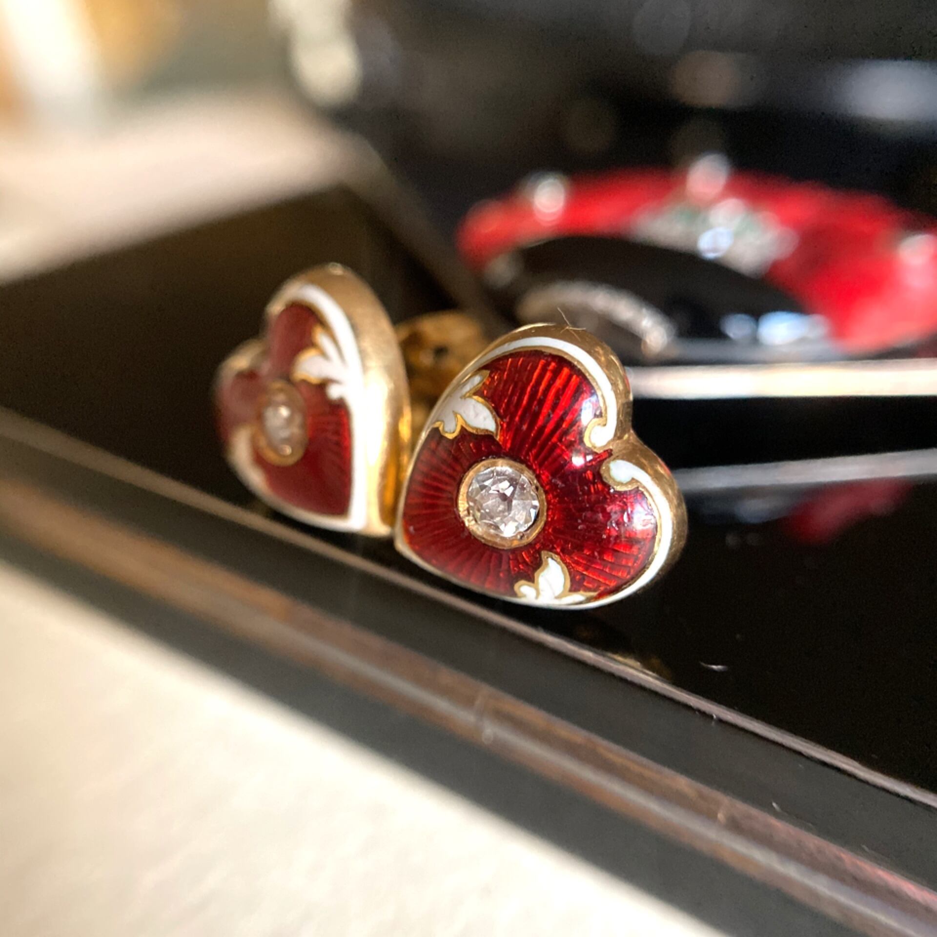 白いエナメルで輪郭を縁取る事で赤のグラデーションに印象を与え、その中央には2.5ミリほどのオールドヨーロピアンカットダイヤモンドがサイドから延びるアカンサスの葉に包まれるようにセットされています。