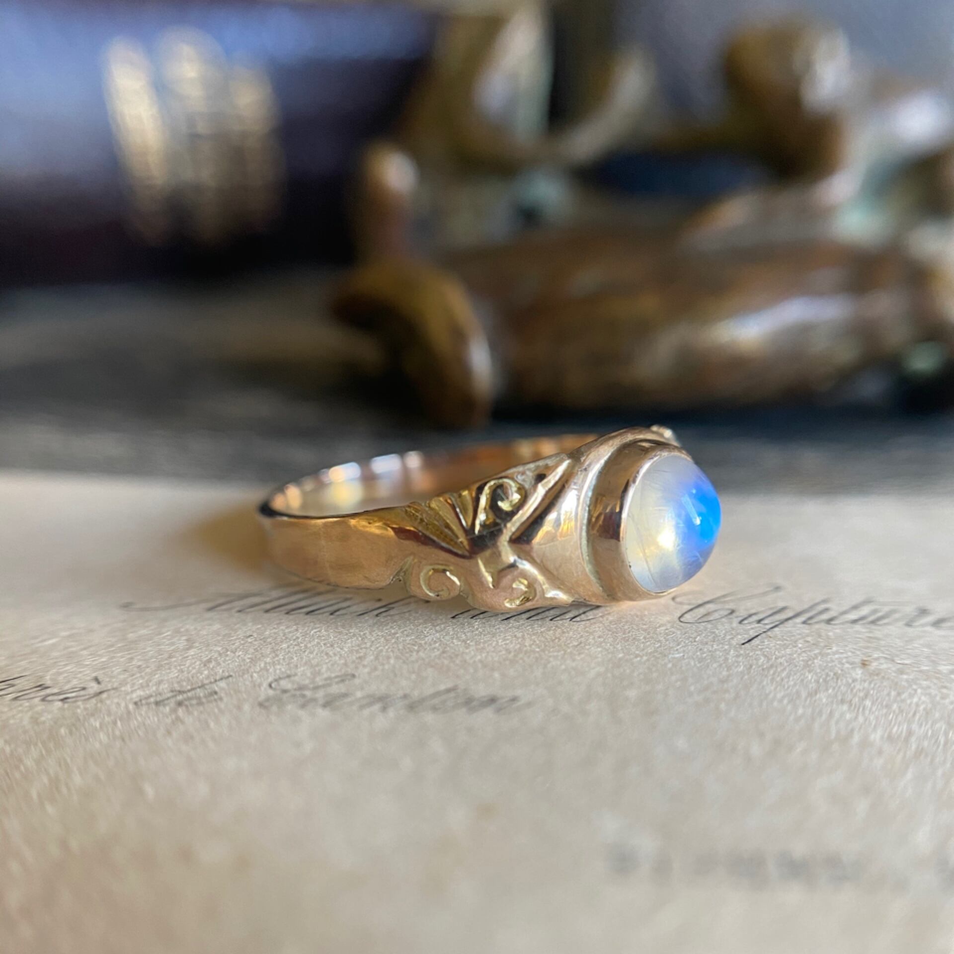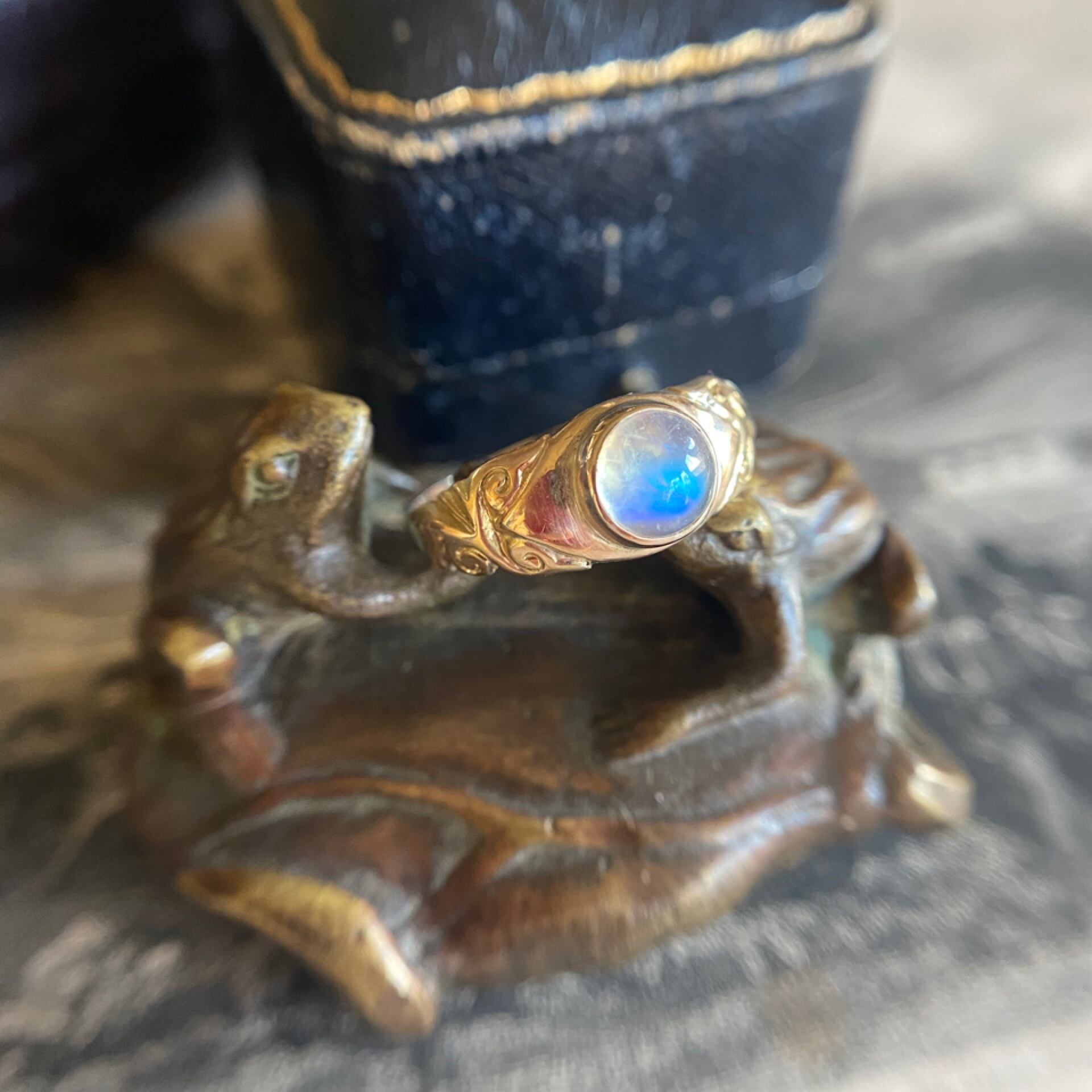 青く、ほわっとしたシラーが月の光を思わせるブルームーンストーンリング。