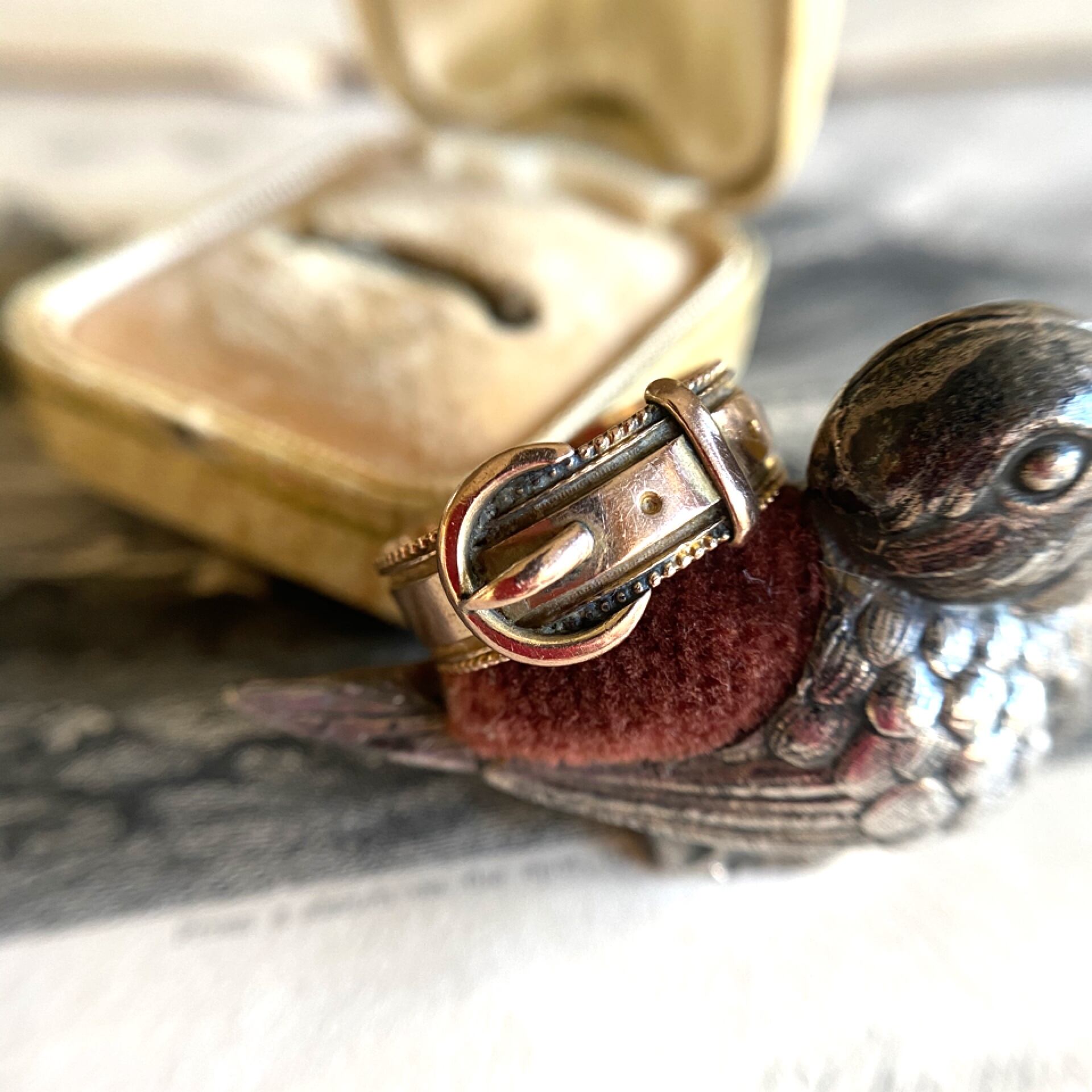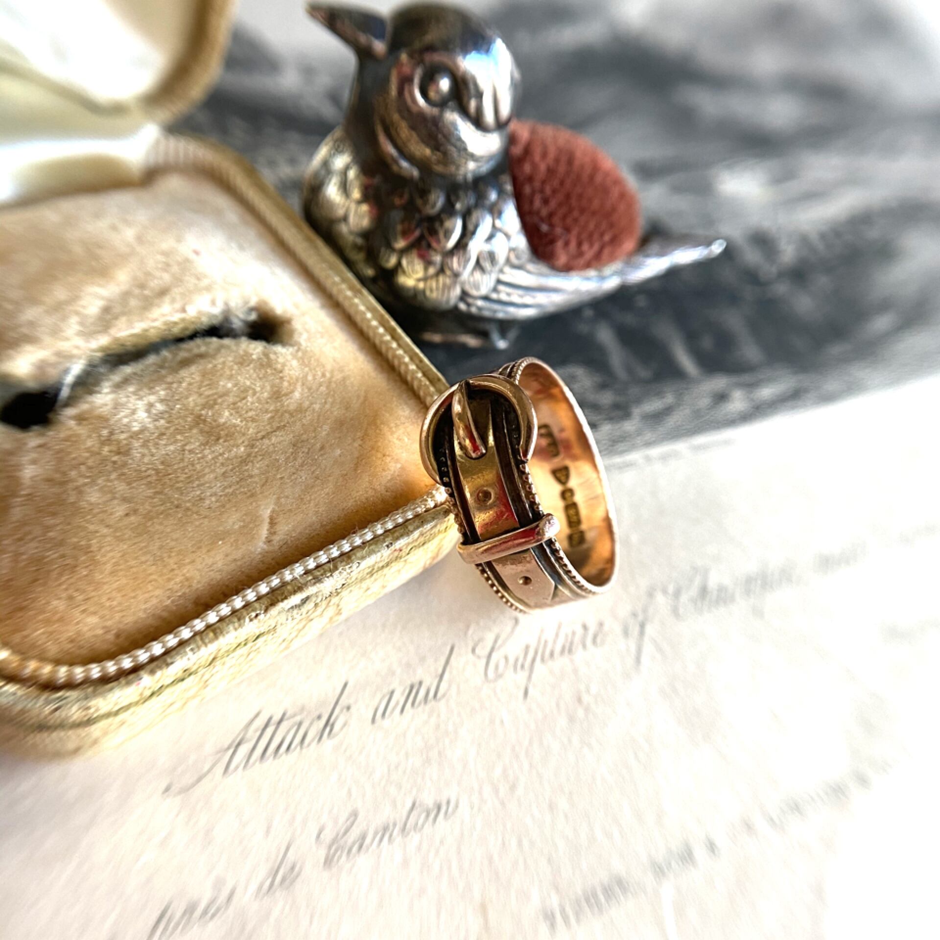 細すぎず太すぎない6mm幅のリングですが、細部をよく見ますと、手の込んだ作りである事がよくわかります。例えば、リングの左右全体に打たれたミルグレイン、ベルトのフロントのバックルもまるで本物のベルトに見間違う程の出来栄えぶり、1919年に作られた物とは思えないモダンなテイストがデニムなどのパンツ系のカジュアルスタイルにもしっくりとはまる本当にカッコいいリングです。
