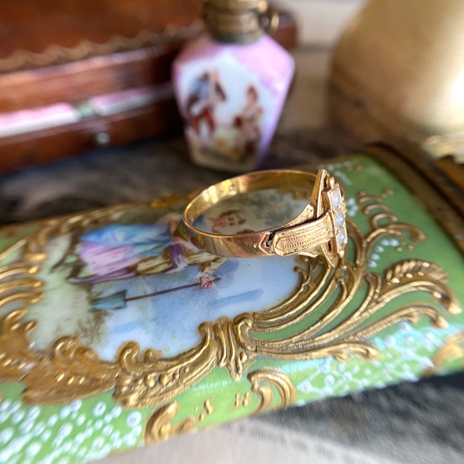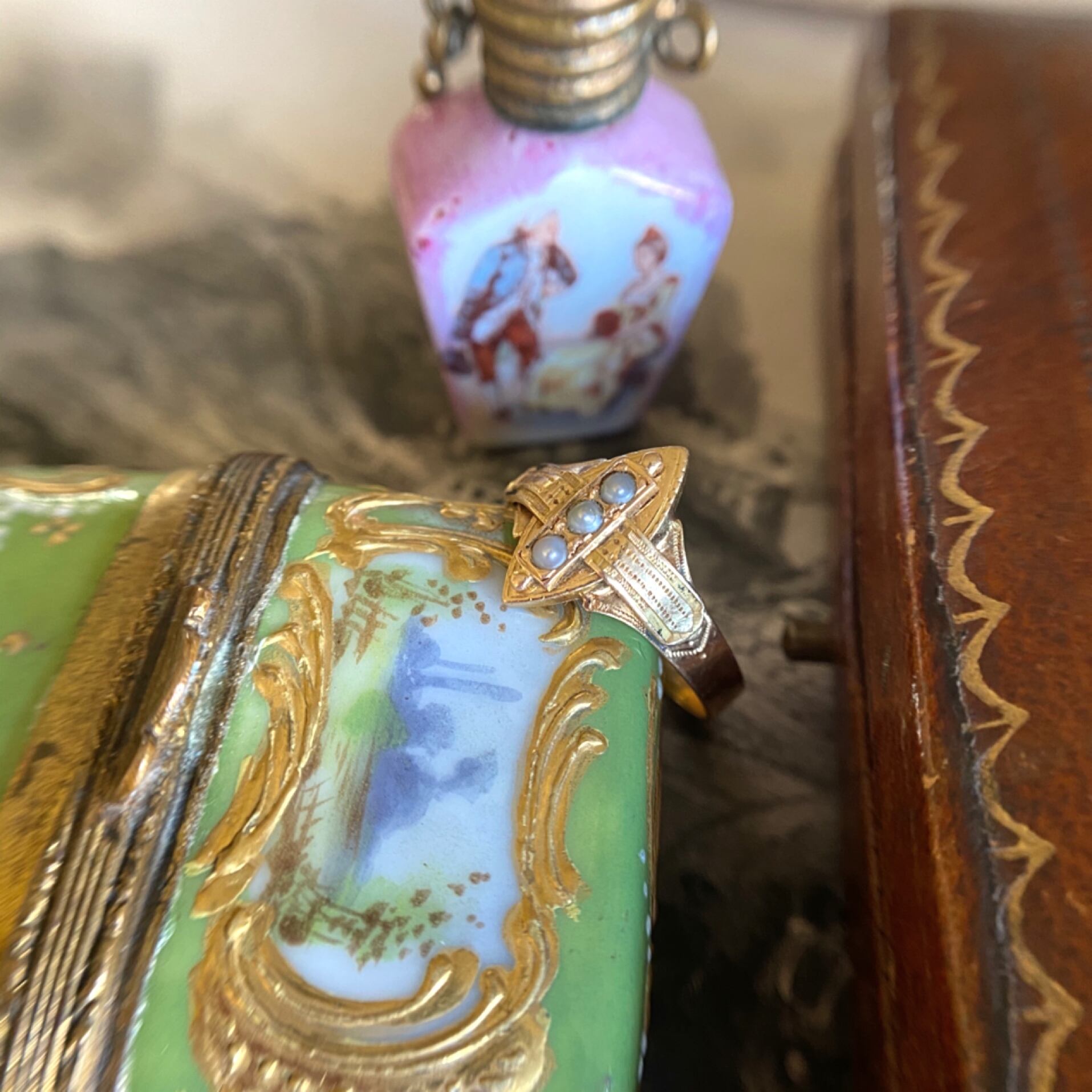 百年以上の時の中で、シードパールの表面が自然なマット感が出ていて それが控えめな雰囲気を醸し出しています。また、ゴールドの一部にクロズミがみえている箇所がほんの少しありますが、使われてきた風合いを暮らしの中で愉しむのには全く問題がないです。