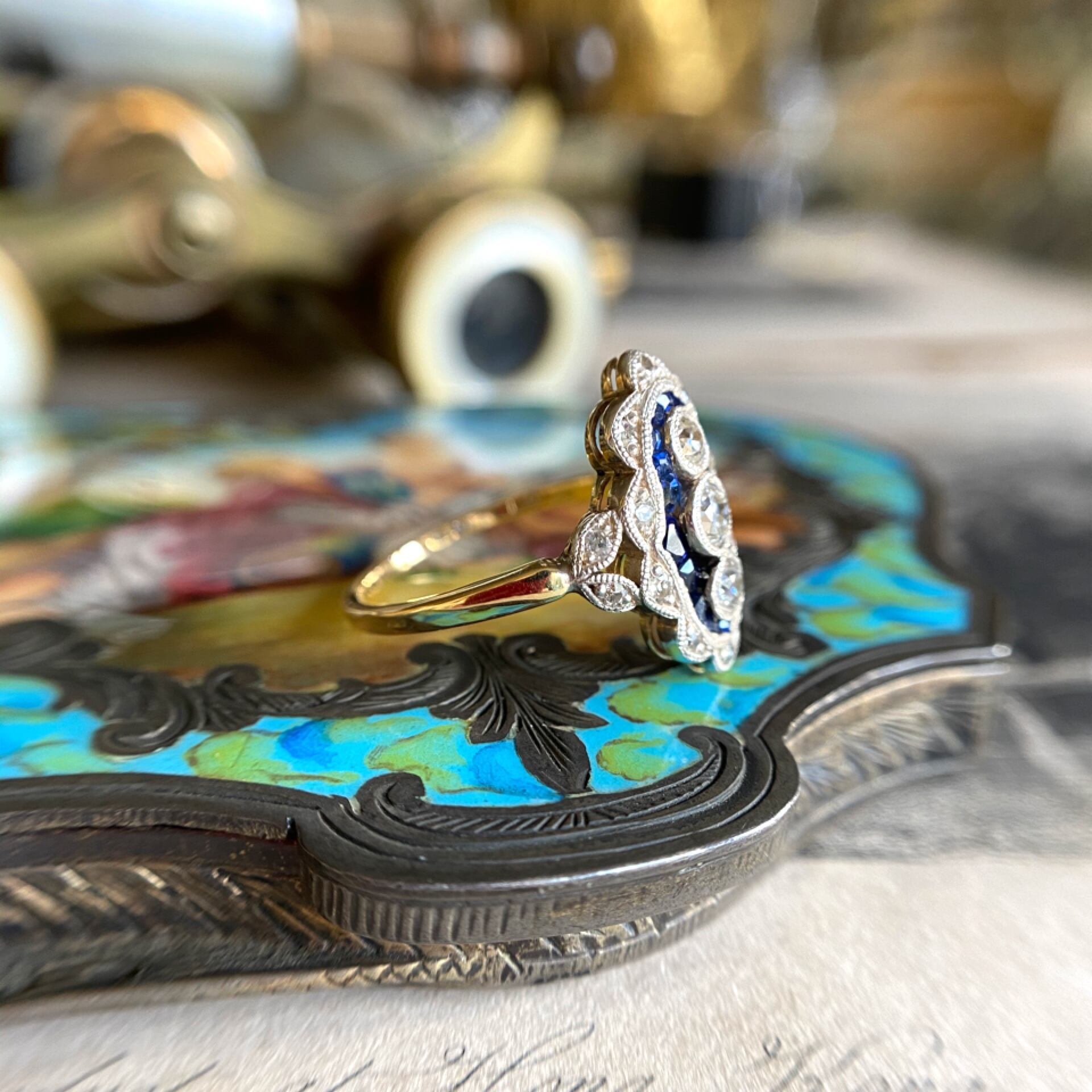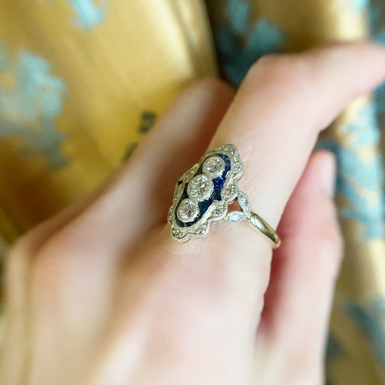 サファイアは対比の挿し色として用いられ、全体的に引き締しめ感を与えながらも女性らしさが際立ち、キリリと凛とした知的な美しさを感じるリングです。