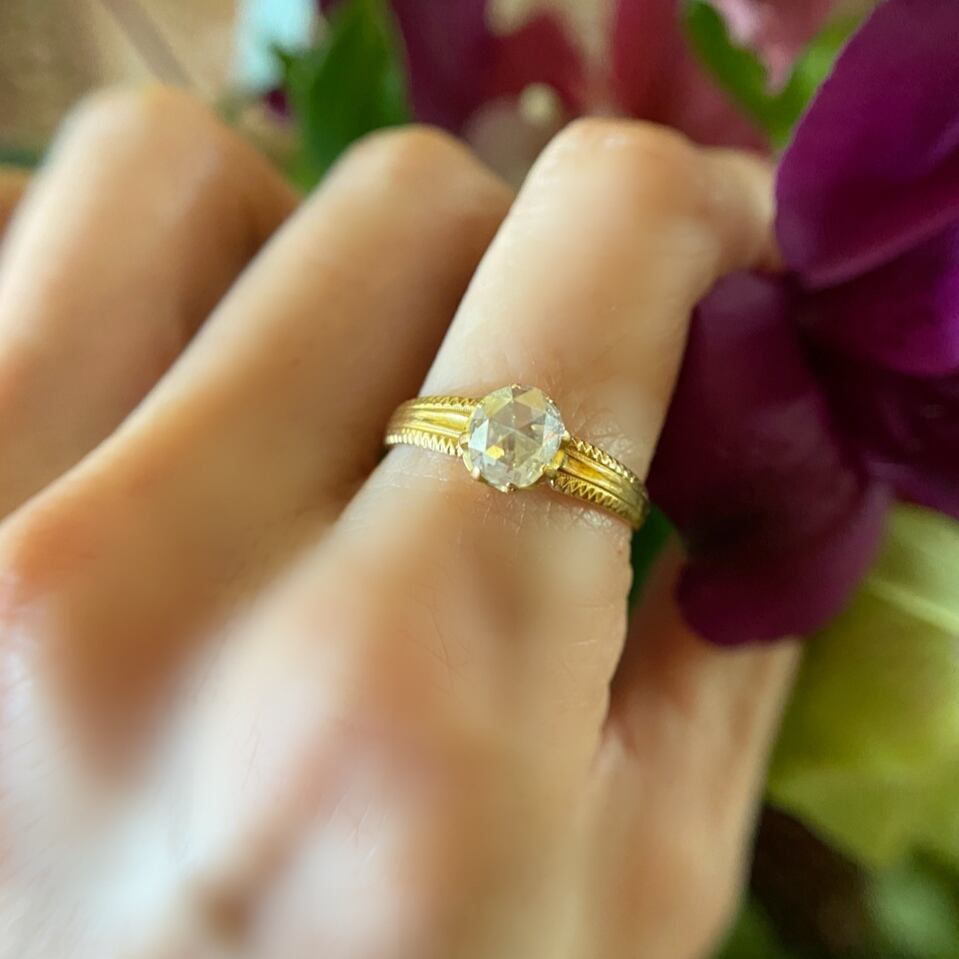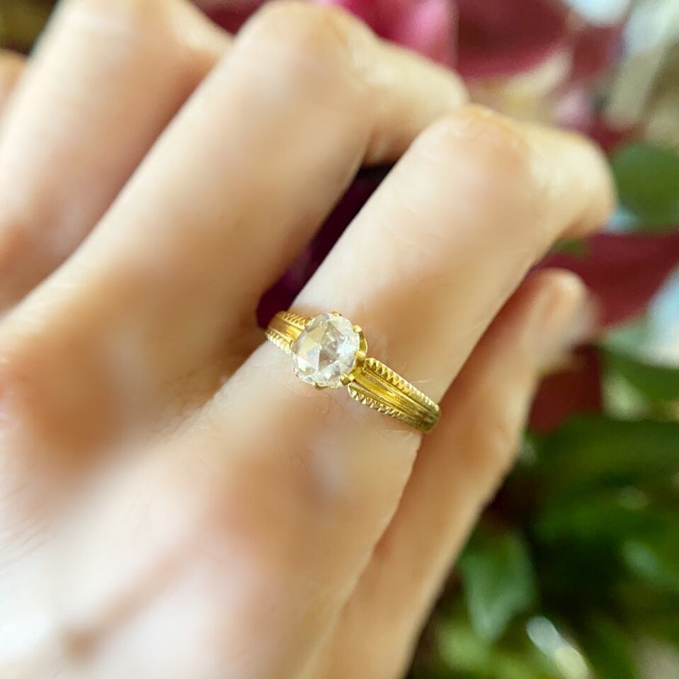 平べったいローズカットダイヤモンドもありますが、こちらのリングはダイヤモンドがドーム型に厚く盛り上がり、透明度も高く、カットされた面に光が当たりゆらゆらと穏やかに輝き、時折見せるギラッとした一筋の光が魅力的です。