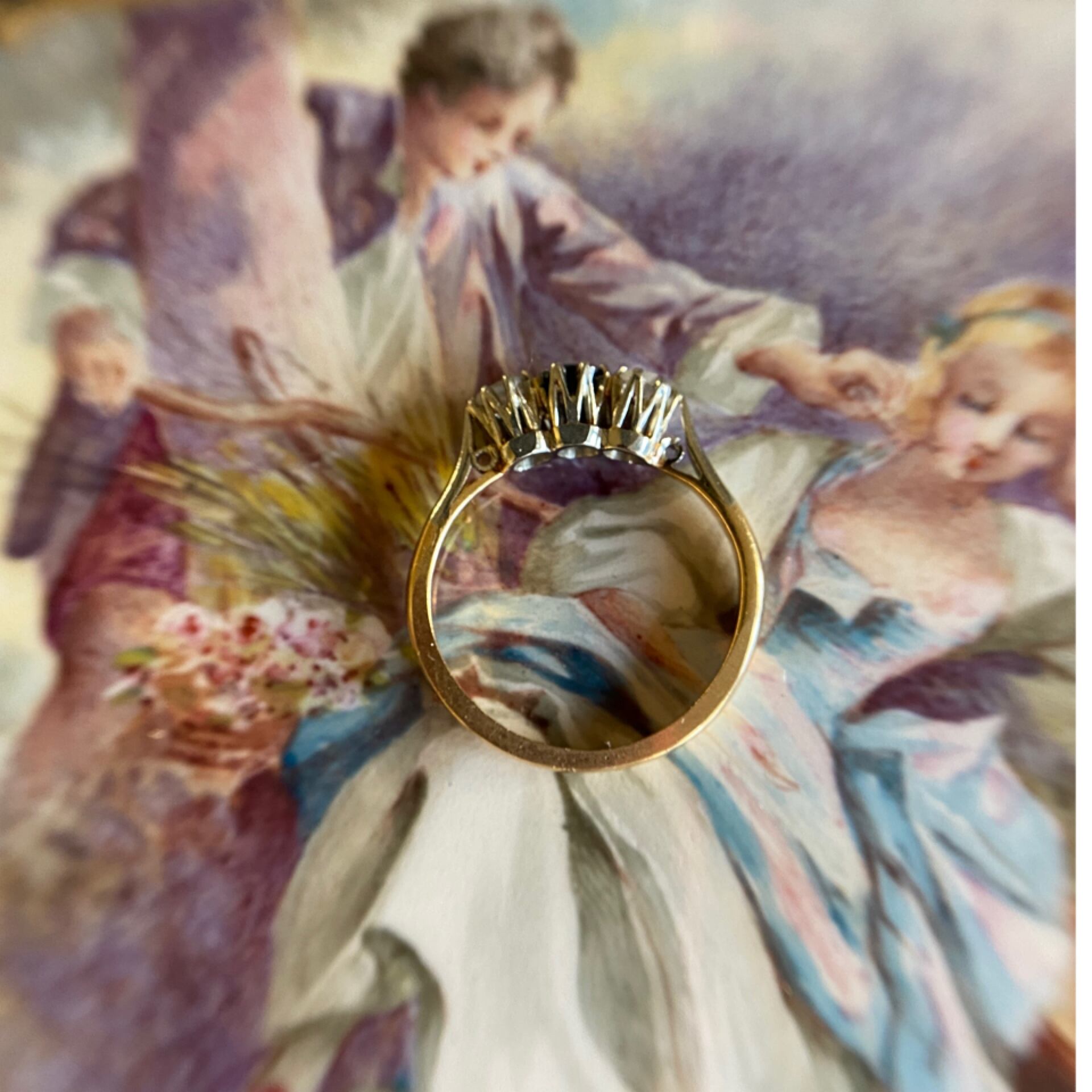 シャンクは装飾のないシプルさがかえってダイヤモンドとサファイアに存在感を与え、そのシックな輝きはアンティーク好きにはたまらないリングです。