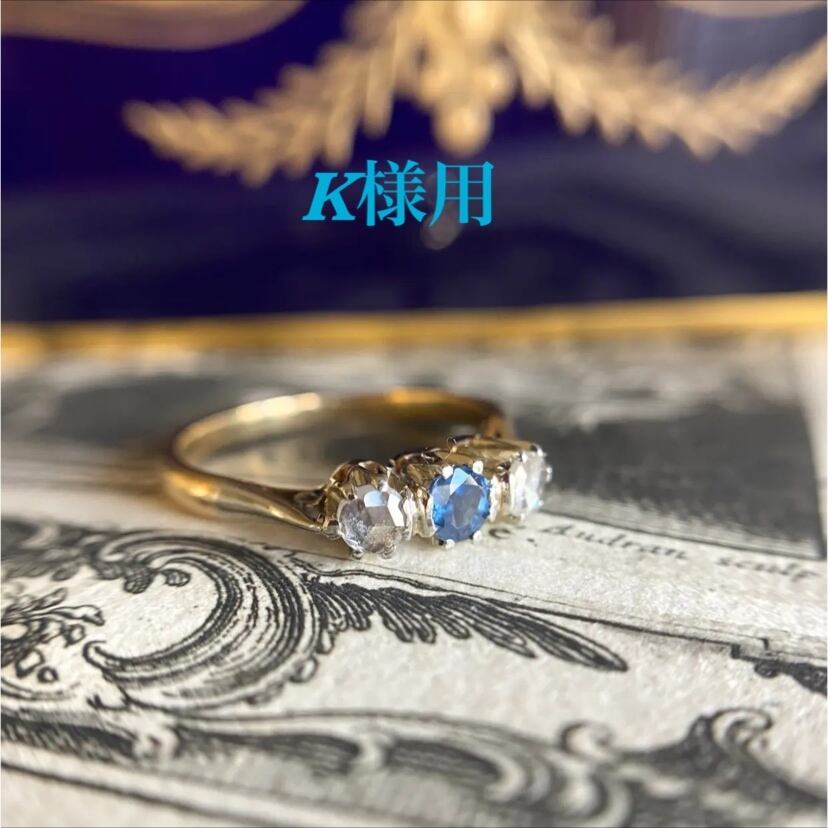 2粒の小さな荒削りなローズカットダイヤモンドの間に、鮮やか 1粒のサファイアを挟んだスリーストーンリング。