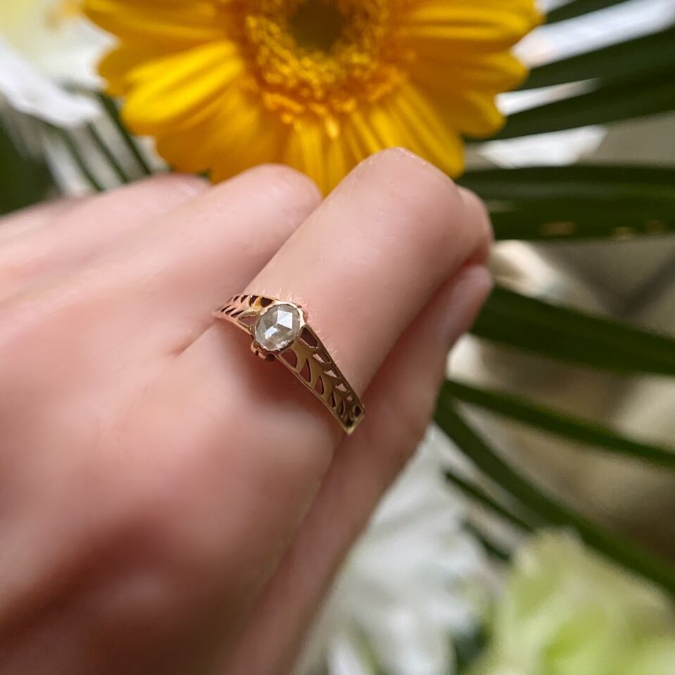 鉱物的な名残さえも感じる渋い輝きにカッコよさを感じるローズカットダイヤモンドソリティアリング。