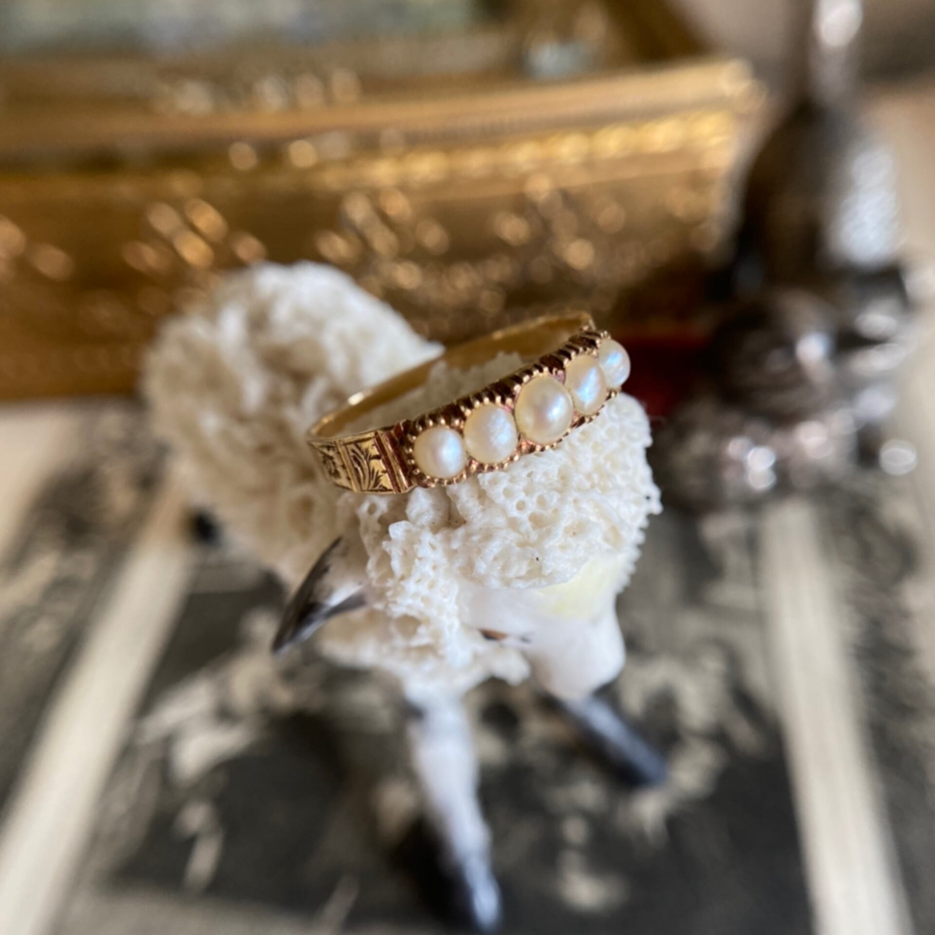 そんなナチュラパールが5粒、金糸のようにデザインされた爪に囲まれて、その中で可愛らしく整列したヴィクトリアンリングは、クローズドセットされています。