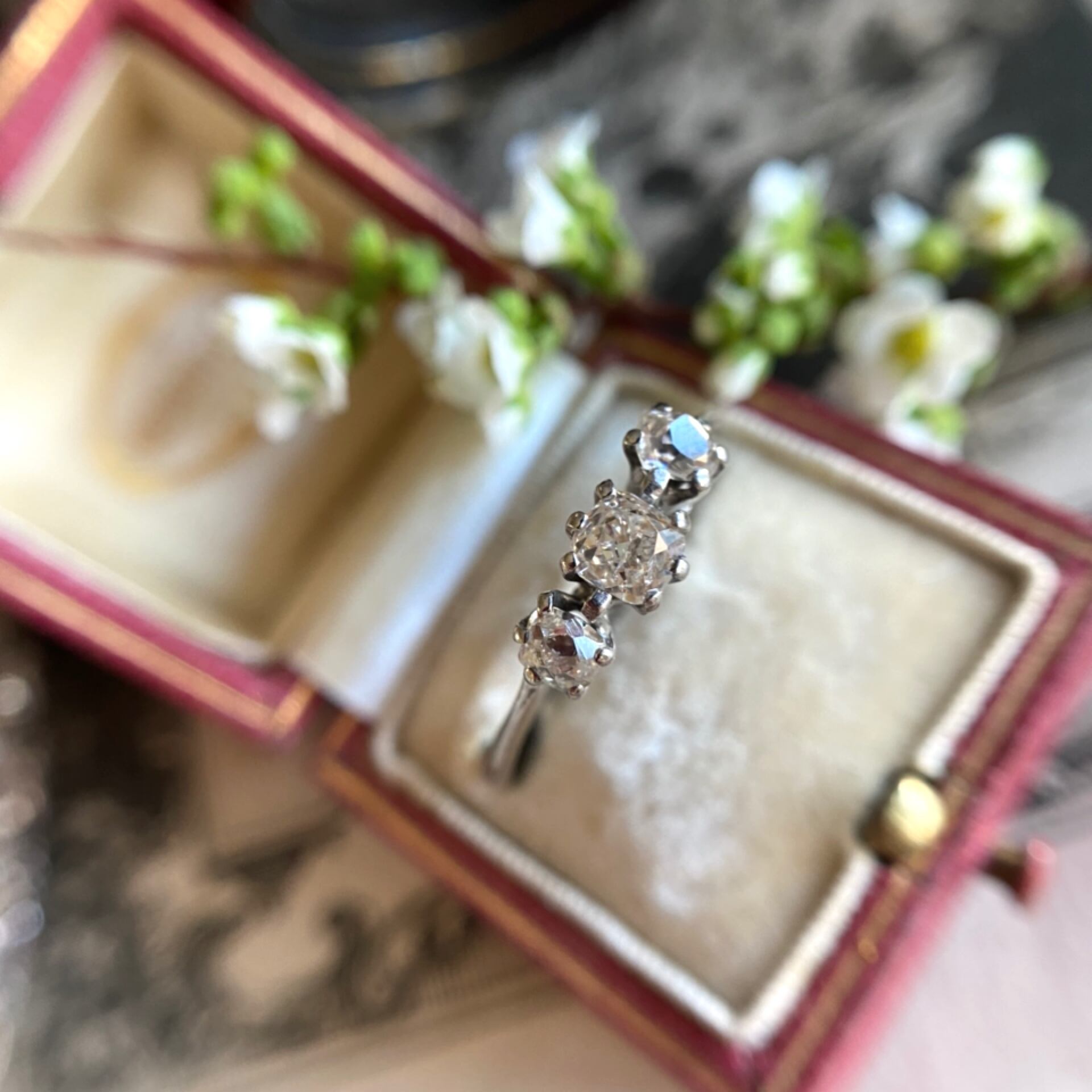 コロンとした厚みのあるオールドマインカットダイヤモンドを3つ並べたスリーストーンリング。