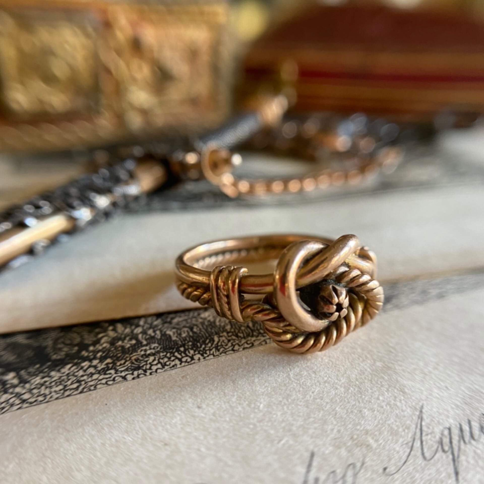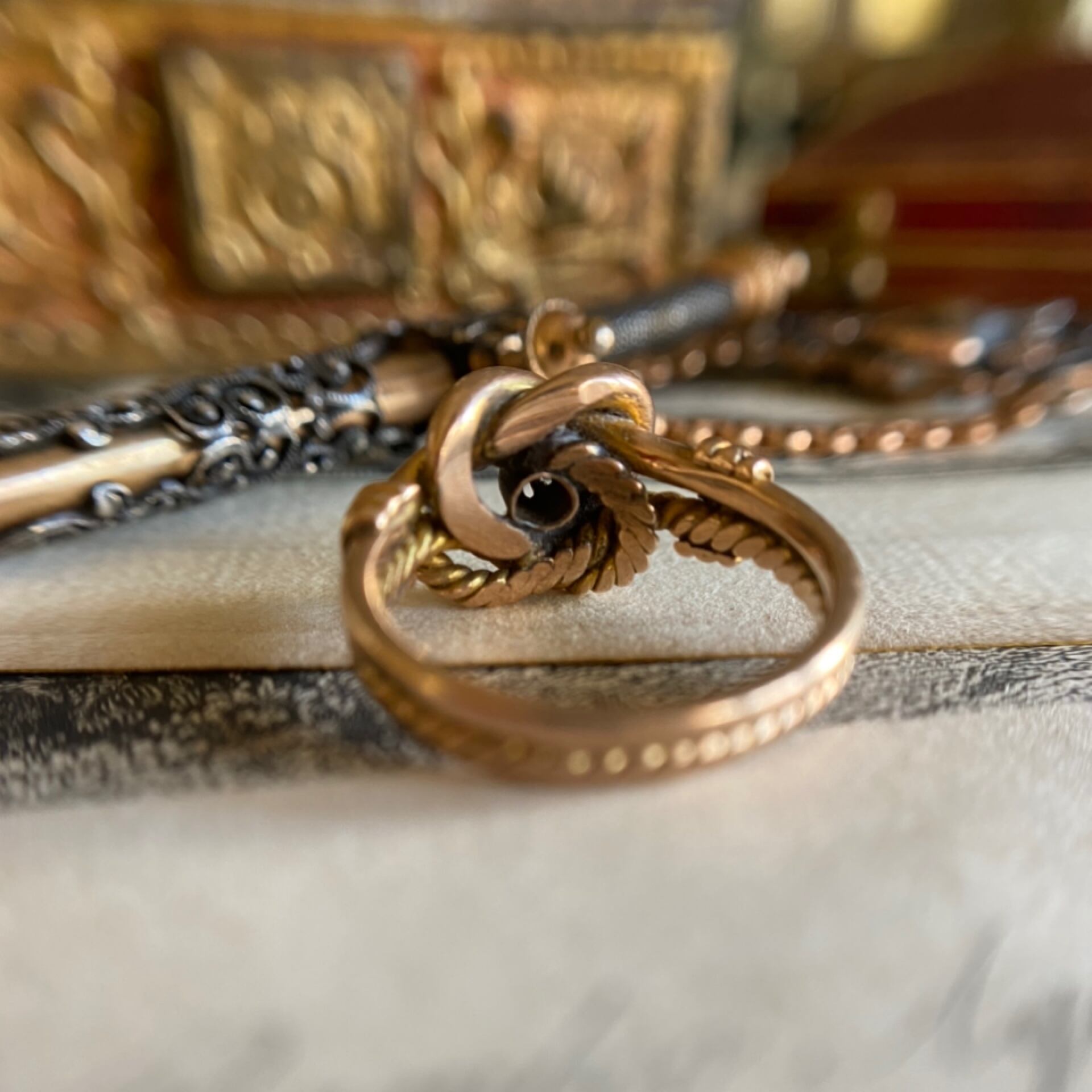 スムーズロープとツイストロープの2つのテクスチャーのローズゴールドが絡み合いセンターで結ばれたノットリング。