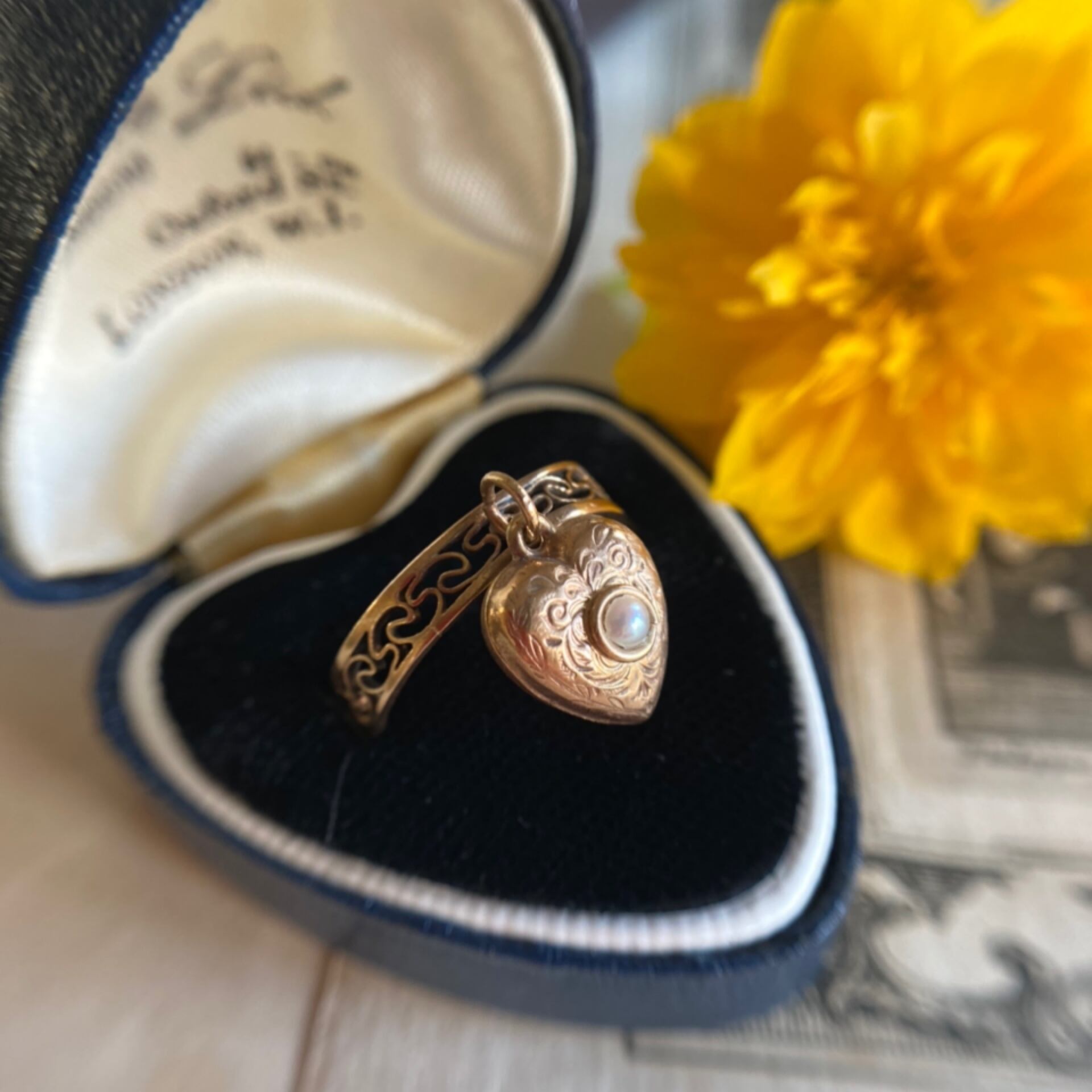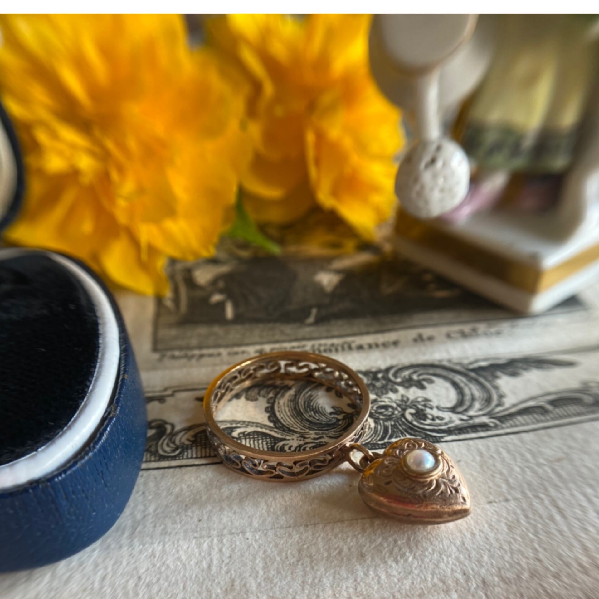 コロンとふっくらふくらんだローズゴールドのハートに、シードパールが1粒セットされた愛らしいチャームが付いた透し彫りリング。
