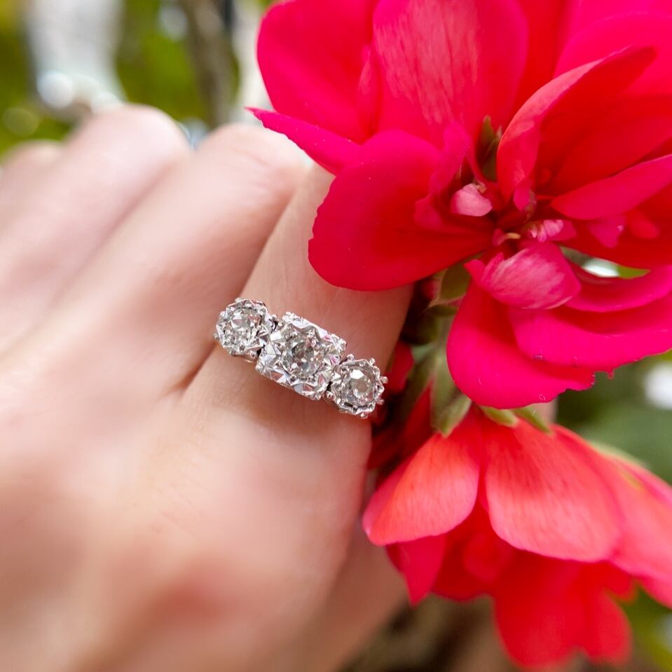 四角のプラチナの台座に花のモチーフを縁取りした中にダイヤモンドを3つ深く埋め込むようにセットしたトリロジーリング。