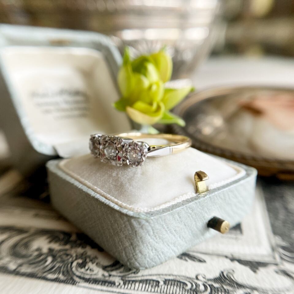 中央は約4mm、両隣は約3mmほどの少し楕円型のオールドマインカットダイヤモンドがアール・デコらしい幾何学的な花弁模様の爪にセットされ、その模様に反射する事でダイヤモンドがより一層大きく見える工夫になっています。
